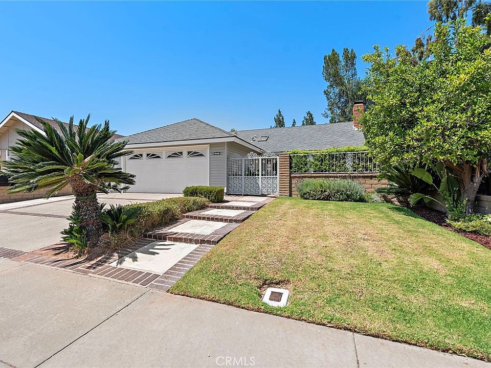 Laguna Terrace single level home located on a cul-de-sac offering privacy with no homes behind. Enclosed front patio provides additional privacy for a front yard entertaining or relaxation. Freshly painted throughout, laminate flooring and an oversized sunroom off the dining area provides additional living space. Large living room with tiled entry, wood shutters and a brick fireplace. Kitchen features stainless steel appliances and granite countertops open dining room and French doors that lead to the backyard. Primary and secondary bathrooms have been upgraded with granite countertops, tiled showers and glass door enclosure. The primary bedroom has French doors that conveniently lead out to the side yard. Spacious backyard with plenty of room for entertaining or play with views of a tree-lined sky and mountains in the distance. Inside laundry, newer heating, air conditioning and water heater in the last 5 years. Conveniently located near San Remo and Santa Vittoria parks, tennis courts, sports courts, playground and Joaquin Elementary.