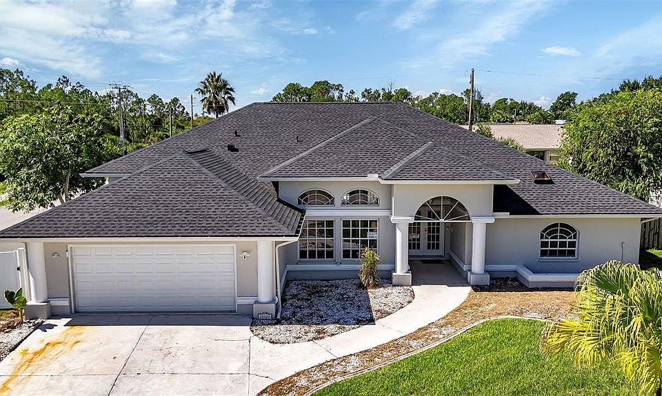 WOW! GORGEOUS RECENTLY RENOVATED OVER 3000 SQ Ft LUXURY HOME - NO FLOOD ZONE - NO STORM DAMAGE OR WATER/FLOODING WHATSOEVER - HIGH & DRY! Priced at a very low $165.07 a sq ft comparatively to the other homes on the market in a 1/2 mile radius - Welcome to Your Dream Home where Luxury and Modern Elegance eagerly await. Remodeled by the owner's father, his vision has been meticulously brought to life in this stunningly renovated home. Imagine stepping into this exquisitely remodeled residence, featuring 3 bedrooms, 3 bathrooms, and a spacious 2-car garage. With a brand-new roof (2023) and 1 of the dual A/C units was replaced in 10/2020 and the 2nd AC unit was replaced 7/2024, this home ensures comfort and reliability. Picture yourself leisurely relaxing in your private oasis, where a sparkling aqua blue pool shimmers invitingly under the sun. The pool, complete with a screen enclosure and a covered lanai, beckons for leisurely afternoons. The convenience of a pool-access bathroom enhances your outdoor living experience, making it seamless to enjoy every moment outside. As you enter the home, you are immediately greeted by high vaulted ceilings and beautifully integrated architectural features. The modern kitchen unfolds before you, a chef's delight with a large island, gleaming ZLINE stainless steel appliances, high-end stone countertops, and solid wood cabinets. Cooking and entertaining here are an absolute pleasure, allowing you to host gatherings effortlessly. The home is not just spacious; it is huge, with all bedrooms featuring walk-in closets for ample storage. The large master bedroom offers a serene retreat, complete with space for a cozy sitting area. The walk-in closet, equipped with a built-in organizer, keeps your belongings perfectly arranged. The ensuite bathroom entices you with dual sinks, a spacious garden tub for soaking, a bidet, and a separate shower for a refreshing start to your day. New vinyl plank flooring extends gracefully throughout the home, adding elegance and durability to every step you take. This home offers tons of storage throughout, as well as a large utility/laundry room for added convenience. The front dining room is currently being utilized as an office space, providing flexibility to suit your needs. The wonderful privacy fence features an area large enough to discreetly place your boat in the back area. This beautiful home is close to many BOAT RAMPS to choose from, while not in a flood zone. Conveniently located near I-75, this home provides easy access to a variety of attractions. Enjoy a delightful day of shopping at the nearby Peachland Promenade Shopping Center or the Port Charlotte Town Center. Dine at local favorites like The Twisted Fork and Visani Restaurant. For entertainment, catch a movie at the Regal Cinemas or enjoy a performance at the Charlotte Players Theater. Outdoor enthusiasts will eagerly appreciate the proximity to the beautiful parks of Port Charlotte Beach Park and Tippecanoe Environmental Park. The stunning beaches of Englewood and Boca Grande are just a short drive away, offering the perfect escape for a day of sun and surf. Your dream home awaits. It's time to stop dreaming and start actually living your sunshine dreams!
