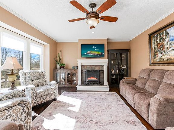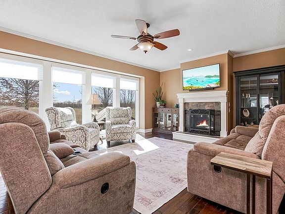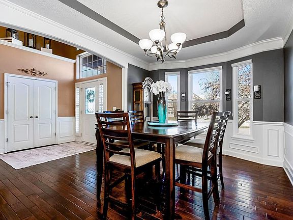 Spacious unique 2 story floorplan boasting 4 bedrooms, 2 bonus rooms and a non-conforming 5th bedroom in the lower level!! NEW windows, NEW fence, NEW composite deck, NEWER HVAC, NEW custom window coverings (main level), granite counters in the kitchen and granite counters and tile floors in all bathrooms. Walk into the 2 story entry to the gleaming hardwoods and open to the formal dining room. Fantastic kitchen with stainless steel appliances, walk-in pantry, painted cabinetry, granite counters, large island open to the breakfast nook, living room and 1/2 bath. Living room has a gas fireplace and floor to ceiling windows. Upstairs you will find a home office with french doors and built-in shelving. Master bedroom also opens up with double doors, large tiled primary ensuite bathroom with separate jetted bathtub and shower, granite counters on the double vanities, nice walk-in closet. Bedroom level laundry room is tiled and has extra storage/cabinetry. Generous sized secondary bedrooms with 2 more bathrooms and 2 of the 3 have large walk-in closets. 2nd bonus room in between floors leading to the FINISHED lower level with 5th non-conforming bedroom, full bathroom, media area and plenty of space for relaxing or entertaining! Generous extra storage under the bonus room in the basement. NEW garage doors on the OVERSIZED 3 CAR GARAGE could almost be a 4 car garage WITH 28' DEEP SECTION-perfect for those wanting a workshop, toy space, extra storage, etc. Peaceful fenced yard backing to farmland (zoned agricultural) and no neighbor views-not backing to other homes with new large composite deck, playset with swings and slide, and your very own gardening boxes! Great landscaping throughout. Newer roof and exterior painting. Don't miss this home in the award winning De Soto School District!