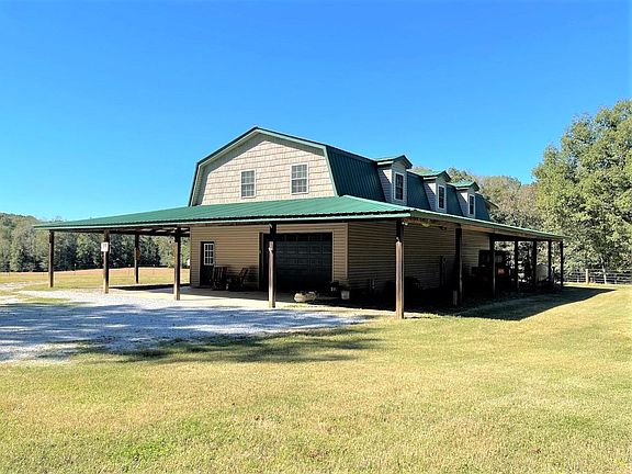 The ultimate barndominium set on 51+ beautiful acres of pristine pastures, wonderful hardwoods and a private Spring-fed pond with additional 650ft of Pickens Creek frontage. Multiple wooded pathways crisscross the property, ideal for late evening walks. Located just 2.5mi from a boat ramp, this is truly the ultimate property. The living quarters upstairs has 2 Bedrooms, 1 Bath with a Sunroom and Huge Livingroom. The expansive Kitchen/Dining area is perfect for entertaining family and friends. Downstairs there is nearly 1500 Sq.ft of semi-finished space ready for your final touches. This space includes a Full Bath, 9 Foot Ceilings, Separate Central HVAC, Insulation & Electrical. The exterior is low maintenance vinyl, a long-life metal roof and outside the building has a 14 foot shed cover on three sides, perfect for parking, storage or future expansion. The workshop is a heavy-duty steel framed construction and has more than 5,500 Sq.ft., with a nearly 2,000 Sq.ft. fully enclosed workshop. The shop is equipped with two 14/14 roll up doors, 200 Amp service, hard-piped central air compressor, insulation, wood-burning heater and super bright lighting. There are more than 2 miles of 6-strand barb wire and hotwire fencing. Also located onsite is a nearly 750 Sq ft. free-standing equipment barn and 3,000+ Sq.ft. working cattle barn that completes the farm. This is altogether one of the cleanest, most well-maintained properties on the market, You will be impressed!
