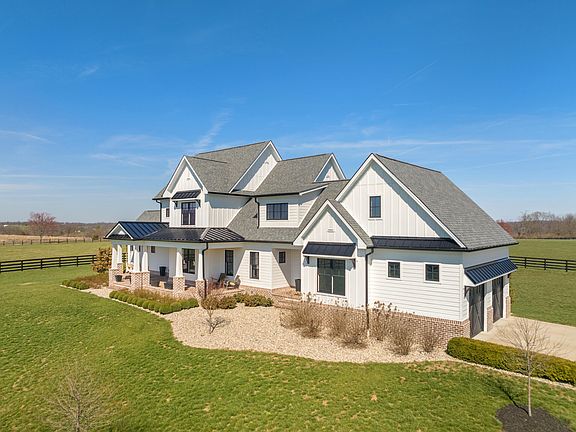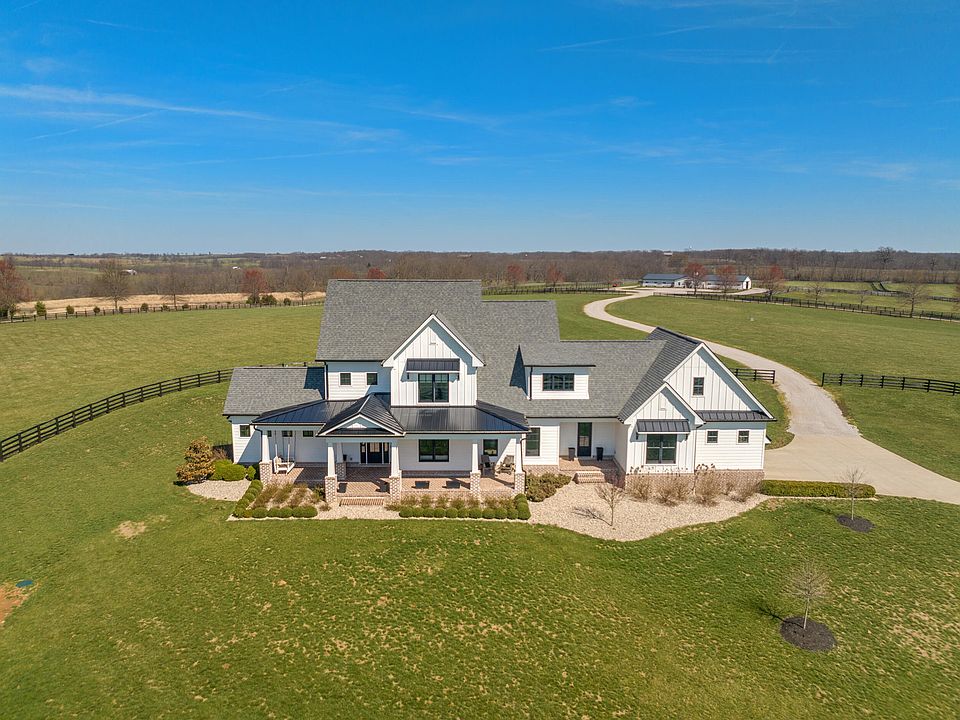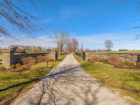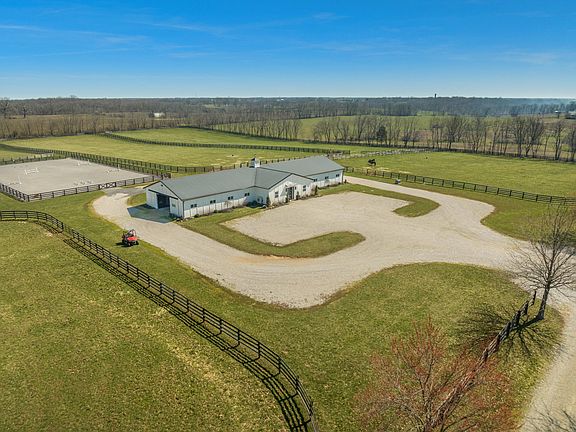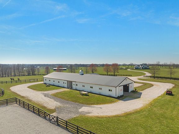 Luxury Equine Living on 100± acres! Cobra Fields is a turn-key horse farm that features a wonderfully built 2020 residence with engineered hardwood throughout, 1st floor primary bedroom with vaulted ceiling, walk-in closet, primary bathroom with tile shower and soaking tub, a grand 2-story living room with brick gas fireplace, kitchen with lg island and Thermador stainless appliances, office with built-in cabinetry and tongue n groove ceiling, mud room and laundry room. The 2nd floor features two guest rooms with vaulted ceilings and ensuite bathrooms, landing with a reading nook or office space, and an exercise/bonus room that could be a 4th bedroom. The full unfinished basement provides ample storage space or could be finished. Farm amenities include a 17 stall barn 12'x12' stalls with lucas style stall fronts w 1 double foaling stall, concrete aisle, wash bay, storage or grooming bay, finished & climate controlled tack room w laundry and feed room w half bath. The barn is complemented by a 100'x200' outdoor riding arena with premium synthetic footing. Other improvements include a 98x30 equipment shed, 3 other sheds, a shared pond, and gorgeous views in every direction!. This turn key property is located directly across the street from World Famous Hill N Dale at Xalapa Farm and near Coolmore's Creekside division, Darley at Stonerside (Godolphin) , Golden Chance farm and more. Excellent soils for raising the best thoroughbred horses in the world!
