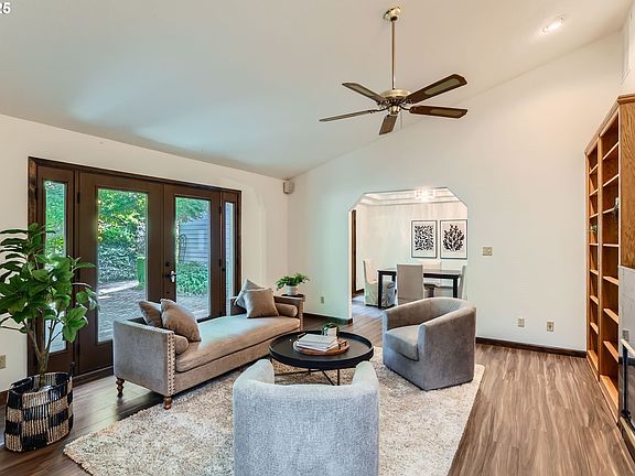 Tucked away on a peaceful stretch of land, this extraordinary Wilsonville estate offers over 5,000 sq ft of beautifully updated living space designed for comfort, entertaining, and multi-generational living.The remodeled chef’s kitchen boasts quartz countertops, custom black walnut cabinetry, and a Thermador 6-burner range with hood—a dream for any home cook. The open layout flows into vaulted living spaces filled with natural light from skylights and floor-to-ceiling windows, showcasing garden views and lush greenery.The family room, featuring oak built-in shelving, opens through double French doors to a storybook courtyard filled with mature landscaping and colorful blooms. A wide covered deck, hot tub, and multiple outdoor retreats offer year-round enjoyment.The main-level primary suite features a gas fireplace, French doors to the deck, walk-in closet, and spacious ensuite bath, with three more bedrooms nearby. The lower level includes a full kitchen, bath, laundry, and separate entrance—ideal for ADU living, guests, or extended family. Expansive windows lead to a covered patio and lawn, while a soundproof room is perfect for a theater, studio, or playroom.Practical upgrades include Blue Raven solar panels (2022), a new roof (2021), a 3,000 sq ft shop with 220V power and office, a barn with tack room and stalls, and a newly built chicken coop.This private, flexible property offers rare space to live, grow, and create—just minutes from town.