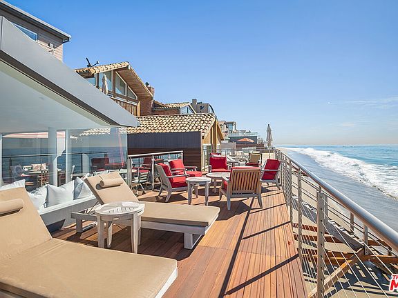 Extraordinary ocean front 5 bedroom estate, situated in the prestigious enclave of the guard-gated Malibu Colony. Walls of glass enhance magical sweeping views of the Santa Monica Bay coast to serene sunsets. Enjoyment can be found in the expansive front entertainment room with charming window seating, a flat screen tv and built-ins. The grand chef-style kitchen offers high-end appliances and double islands in Caesar stone, joining the dramatic living area with soaring ceiling and opens to the seaside patio, lounging deck & stairs to the beach. Ocean front primary suite, with lounging balcony, encompasses the upper level with sumptuous bath & outdoor hot tub on a private rear deck offering mountain views. There are 2 additional bedrooms in the main house. A separate guest unit includes an upper level entertainment room, large bedroom with mountain views & bathroom. Main floor bedroom with bath opens to the private central patio area with a BBQ. Beautiful recent interior designer enhancements make for ultimate comfort while living by the ocean. Smart home integration system throughout the main home. Call listing agent regarding Summer rental months. Nearby to great restaurants, well-known shops, Whole Foods, Malibu Pier & more!