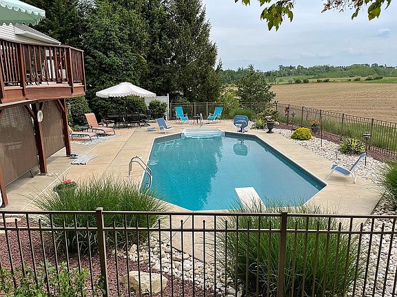 This 2 story home is located in the cul de sac of a small subdivision that is surrounded by 20 acres of green open field space which makes for a private & peaceful neighborhood setting. This home was previously the builder's model home and has many custom upgrades and features including a beautiful propane heated corner fireplace. There is a beautiful undisturbed and unobstructed view of the natural landscape and countryside from the back of the property and the home has oversized windows from which to enjoy this view. The lower level of the home is completely finished and includes an additional 1,125 sq ft of living area that is not reflected in the Zestimate value for this home. This living space includes a 1/2 bath and has sliding glass doors which lead out to a covered patio and a fenced 16'x32' heated inground pool. The surrounding pool area is paved and landscaped.