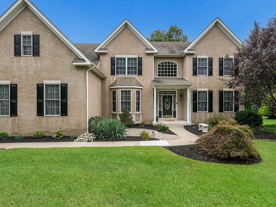 Beautiful custom Colonial offering 5 Bedrooms, 2 full baths and 3 half baths. Covered front entry, leaded glass front door with transom windows opens to 2 story center hall Foyer with split turned staircase with oak railing & painted balusters & gorgeous Brazilian cherry hardwood floors that continue into the formal Living & Dining rooms. Formal Dining room with crown molding & custom sconce lighting. Formal Dining room with tray ceiling, crown molding, chair rail & bump out with triple window. Beautiful Kitchen offering stained 42 maple cabinetry, recessed lighting, granite countertops, tiled backsplash, 16 x 16 ceramic tile floor, stainless steel appliances including double wall oven, built-in microwave over a 6-burner Cerran cooktop & dishwasher, extended center island offers breakfast bar and pendant lighting. The Kitchen opens to Breakfast/ Sunroom with vaulted ceiling & sliding glass door to raised, covered rear patio with skylight & ceiling fan with steps down to a large hardscaped patio & rear yard with mature trees. The Family room offers a gas fireplace with ceramic tile surround & 2 story vaulted ceiling with recessed lighting & ceiling fan. French door to first floor Office with hardwood floor. The first floor also offers 2 powder rooms & Mudroom/Laundry room with built-in cabinetry & access to driveway. The turned staircase in Foyer leads to a large 2nd floor landing overlooking the Family room below. Huge Master Bedroom Suite offers tray ceiling with ceiling fan & recessed lighting, crown molding, gas fireplace, 2 walk-in closets, sitting area with ceiling fan & full luxury bath. Master Bath features vaulted ceiling, ceramic tile floor, glass door shower with ceramic tile walls & built-in seat, corner soaking tub with ceramic tile surround & double vanity with granite countertop, under-mount sinks & built-in vanity. Four additional roomy bedrooms with ceiling fans & full hall bath with double vanity & tub/shower also on 2nd level. Full, finished basement with Berber carpeting, recessed lighting, half bath & multiple entertaining areas. 3 car attached, side entry Garage. 2 zoned central air & propane heat.