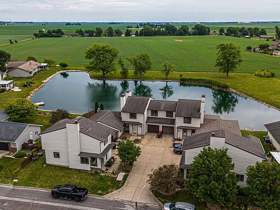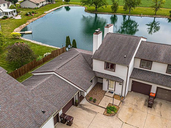 This excellent 2-3 bedroom, 2 full bath north side vinyl sided condo is situated within CEL school district and features handy interstate access -- and that water view! The main floor boasts an inviting foyer, bright living room with a corner woodburning fireplace, equipped eat-in kitchen with sliding glass doors that lead to a generous newly constructed (2020) rear deck overlooking the gorgeous stocked pond out back (new luxury vinyl plank flooring installed in kitchen in 2022), two nice sized bedrooms with newer carpeting (2022), and a full hall totally renovated bath with a sharp tiled shower surround. The full partially finished basement is host to a large family room with a second woodburning fireplace, optional 12X10 third bedroom (no egress), second nicely updated full hall tiled bath, laundry/mechanical facilities, and great storage/work space. This all electric residence also features an attached garage, architectural roof, vinyl windows (2021), and all appliances to remain (all replaced within the past four years). $175.00/month association dues include exterior maintenance, lawn care, snow removal, and garbage. Low maintenance waterfront living at its best... truly!