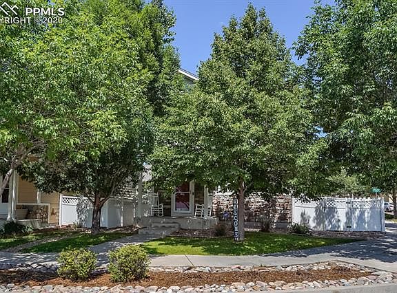 Views, views, and views!!!! Nestled in the highly desirable Spring Creek community on a larger corner lot, this quaint home features unobstructed views of the entire front range from the front porch and master bedroom balcony. Take in the fully landscaped front yard with a covered patio, perfect for sitting and enjoying the mountain views, and note the vinyl privacy fencing in the back yard complete with a 2 car detached garage. The main level features an open concept design, boasting an oversized kitchen with extra cabinets and sprawling counter space. The kitchen opens to the dining room area and family/living room, which comfortably fits a large sectional, has an additional nook for kids toys, and features a cozy gas fireplace. The half bathroom is conveniently located on the main level as well. Upstairs, you will find 3 bedrooms, including the master bedroom suite, complete with a private outdoor balcony, perfect for sipping coffee on in the mornings while taking in the mountain sunrise views. The master bedroom also includes a walk-in closet and full private bathroom. The two additional bedrooms are spacious, and a second full bathroom and laundry space finish this well-designed upper layout. Enjoy the comfort of A/C for hot summers! Detached garage offers ample storage! Perfectly located near local shopping amenities, parks, schools, dining, shopping, Fort Carson, Peterson AFB, and Schriever AFB. Come see this adorable home today!