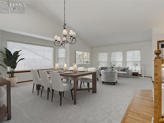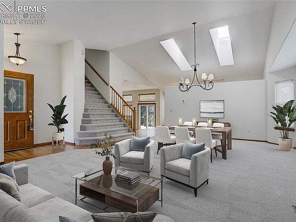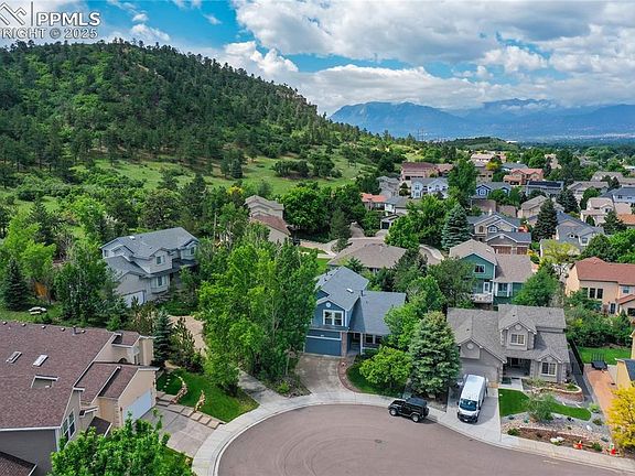 Nestled in the sought-after St. Andrews community, this beautifully updated two-story home offers stunning mountain views, modern amenities, and an unparalleled location adjacent to Palmer Park. Situated on a quiet cul-de-sac, residents enjoy immediate access to over 730 acres of preserved natural landscapes, featuring 25 miles of hiking, biking, and horseback riding trails, as well as scenic overlooks with panoramic views of Pikes Peak and the foothills. Spanning 3,492 square feet, the home features four spacious bedrooms and four bathrooms, including a luxurious upper-level primary suite complete with a five-piece bath w/new flooring, cozy fireplace, walk-in closet, and soaking tub. The main level's open floor plan is ideal for both everyday living and entertaining, highlighted by a grand great room with a fireplace, vaulted ceilings, and walkout access to the backyard. The gourmet kitchen boasts hardwood floors, stone countertops, tile backsplash, pantry, natural wood cabinetry, and includes appliances, complemented by both a formal dining area and a kitchen dining nook. The partially finished basement offers 9-foot ceilings, a large finished second family room, and an expansive unfinished area, providing ample space for storage, a home gym, or future customization. Recent updates, including brand-new interior paint and plush new carpeting throughout, ensure a fresh and modern ambiance. Outdoor living is enhanced by a wood deck and a partially fenced backyard, offering a private retreat for relaxation or gatherings. The oversized two-car garage includes built-in storage and a garage door opener for added convenience. This home is just minutes from shopping, dining, & everyday conveniences. Additional features such as central A/C, energy efficient windows vaulted ceilings, & more. This move-in-ready home presents a rare opportunity to enjoy modern updates, views, & immediate access to the natural beauty & recreational offerings of Palmer Park.