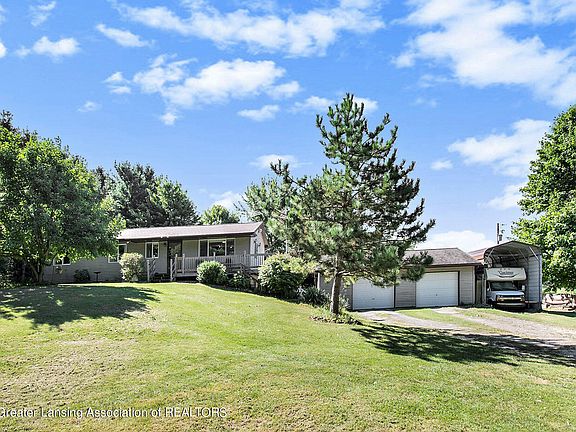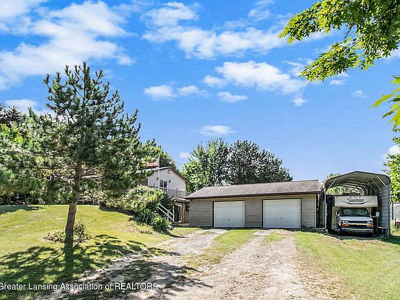 The lower level offers additional living space with a fourth bedroom, a family room with a pellet-burning stove, and a convenient walkout to the back yard. The roof is relatively new, having been replaced about five years ago. Washer and dryer are included in the sale as well. Outside, the property includes a 32x24 detached 2.5-car garage/pole barn, along with an additional 32x24 pole barn with a dirt floor and electricity. There is also an RV Carport on the side of the detached garage, 12x26 which is enclosed on 3 sides with partial concrete. The mostly wrap around porch is wonderful to take in the gorgeous sunsets or watch the wildlife romp around in the yard! The fenced backyard provides privacy and security, while the beautifully maintained grounds feature an array of fruit trees, adding both beauty and utility to the landscape. With plenty of room to roam, this property is a true retreat, blending comfort with the serenity of nature. Not too far from Lansing, Dewitt or St Johns, this conveniently located home is ready to make all yours! Schedule your showing today! Additional home/drone photos and floor layout to be uploaded when listing goes live on Wednesday, September 4th, per coming soon status.
