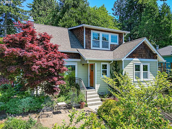 A charming College Hill 1940 Bungalow with fantastic west facing views sits on a large sunny lot. Well cared for 2-story with coved ceiling, built-ins, and wood flooring throughout most of the house. Built as a single story 2 bed/1 bath house, owner added second floor with bedroom, bathroom, and family room in 2010 along with new roof, siding, updated electrical, plumbing, and sewer line. Upstairs 'family' room could have wall installed for 3rd bedroom? Updated galley kitchen has stainless steel appliances and views of the back yard. Cozy living room with gas fireplace insert and large picture window gives you views of the SW hills toward the coast range - beautiful sunsets! Patios in front and back provide outdoor living spaces for morning coffee and BBQ dinners. Yard is terraced and landscaped. Upper back yard boundary is on an alley, could be great place for an ADU? Full 604sf unfinished basement has washer and dryer and access to garage along with lots of storage space. Close proximity to parks and shopping.