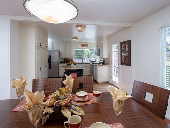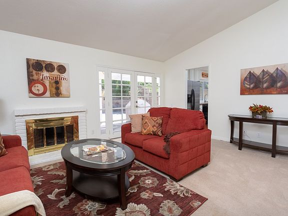 Rare Cul-de-sac single story home on a huge 10,000sqft+ lot! Charming courtyard entry has a water feature, vaulted ceilings, fireplace in living room for cozy fires, large open dining and kitchen combination is excellent for entertaining, beautiful large island is great for food prep or extra seating, and ample cabinetry allows for tons of storage. Hardwood floors run through the kitchen and dining into the hall and toward the spacious guest bedrooms and bath. The master suite has its own dedicated bath with tiled shower surround and sliding glass doors for a retreat to the back patio. The ample back yard includes a covered patio perfect for BBQs, plenty of grass and nice landscaping options at the slope. Central heat and AC, scraped ceilings, and fresh paint also make this home a perfect fit for anyone looking for a move-in ready option.