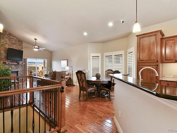 Welcome home to your luxury patio home! Walk inside and be greeted by gorgeous hand-scraped rustic engineered hardwood floors throughout the main level and high vaulted ceilings. To the right will be the gourmet kitchen with rich dark wood scattered cabinetry with custom pullout drawers, dual undermounted sink, stainless-steel appliances with gas range, granite countertops, decorative tile backsplash, an eat-in area with bay windows, plantation shutters and jaw-dropping mountain views! The main level has recessed lighting throughout and pendulum lighting in the kitchen area. The kitchen opens up to the dining area that also has a large bay windows with plantation shutters. The walkout living room has a handsome floor-to-ceiling stacked stone gas fireplace adorned with a rustic log mantlepiece. Walk out from the living room to your very own private and fenced-in covered patio with plenty of yard space for quaint garden. The walkout master bedroom with walk-in closet has vaulted ceilings, large windows with plantation shutters, and crown molding. The master bath ensuite is exquisite with ceramic tile floors, 2 separate vanities, ToTo Bidet, a huge walk-in tile surround spa-like shower, and a linen closet. The 2nd bedroom and a full bath with granite countertop is also found on the main level. Down in the carpeted basement is a large family/rec room with wet bar, 3 additional bedroom and a 2nd full bathroom. The home has humidifier and the AC/Furnace has ozone light that purifies the air. The garage has a very convenient wheel chair lift as well! All windows are MILGARD Windows. The Santa Fe trail system is right out of your back fence! The HOA includes lawn, exterior maintenance, and so much more!