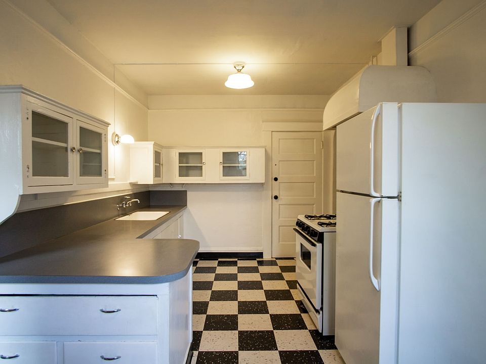 Corner apartmentLuxury vinyl plank floorsShared balconyClassic checkerboard floorsBeautiful architectural detailsGlass fronted cabinets