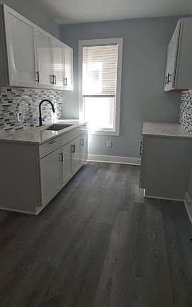 . New kitchen with all new White Euro-look cabinets with hook-up for a gas stove. (Tenants supply appliances).