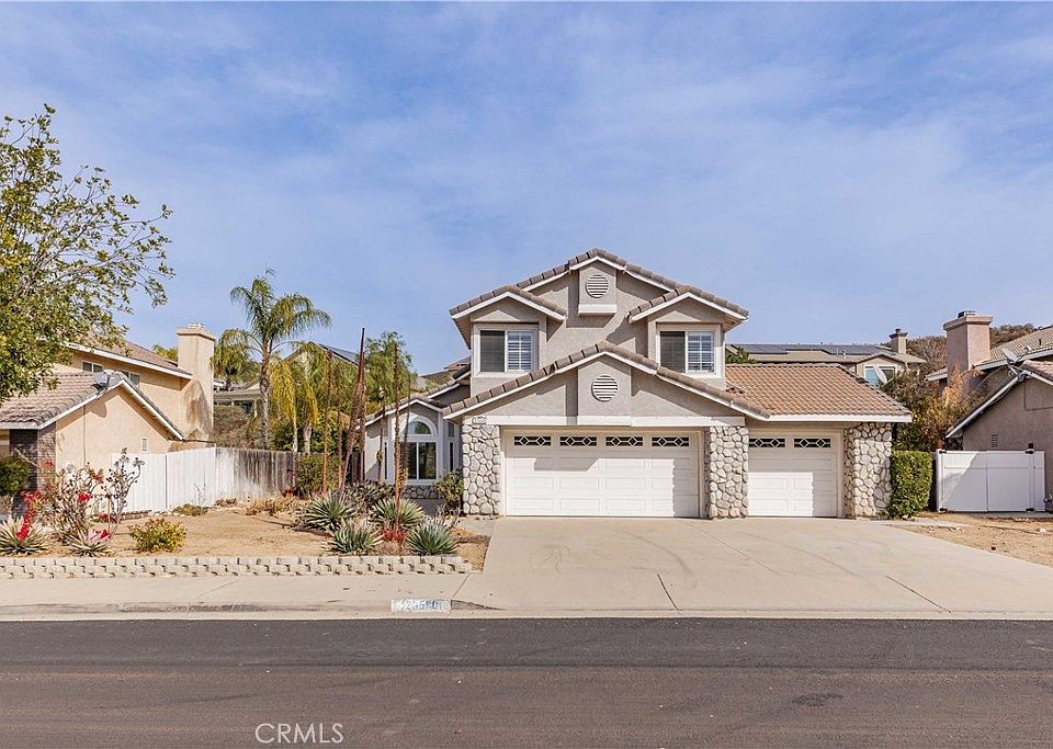 Welcome to 23560 Kettle Road, a beautifully maintained home nestled in a desirable community. This home offers an inviting space perfect for comfort, style, and entertaining. Step into the bright & open floor plan made possible by vaulted ceilings and newly updated front window. The spacious kitchen features a new dishwasher, double oven, walk-in pantry, and an eat-in nook that opens to the cozy family room with a fireplace. Upstairs, you will find the primary suite that boasts a walk-in closet, a luxurious soaking tub, and a large walk-in shower. There are three generously-sized bedrooms, offering ample space for family or guests! For added convenience, the walls have been updated with new paint, as well as most flooring areas. There is also a laundry room includes storage and direct access to the clean, spacious 3-car garage! Other features that you may love include: an updated water heater for energy efficiency, ceiling fans and shutters throughout for comfort and style, and a skylight enhances the natural lighting! Outside is an expansive backyard with raised garden beds, a sparkling pool with new filter equipment, and spa complemented by solar lighting.