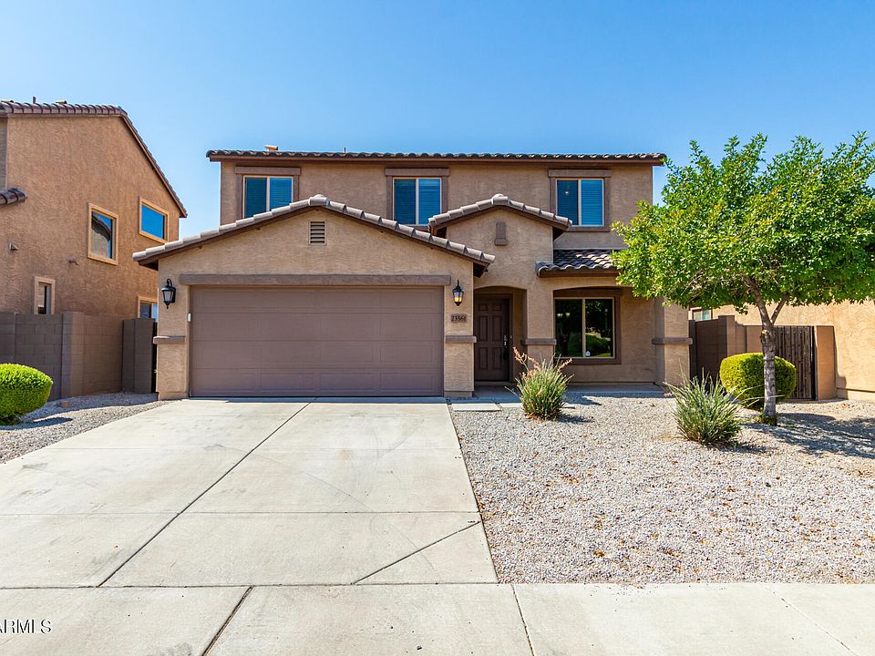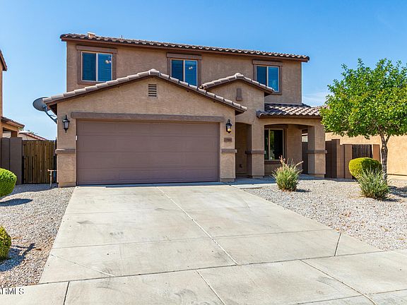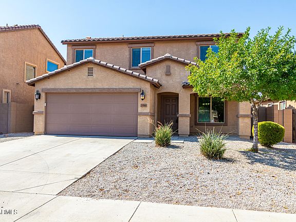 Welcome to this wonderful home in the city of Buckeye, AZ 85326, with 4 spacious bedrooms and 2.5 bathrooms. This property offers a perfect combination of modern style and comfort, it has painted stucco exterior finish, this house is ready to welcome its new family. The house features a 2-car garage with an electric door opener, as well as additional slab parking for 2 cars, providing a total of 4 parking spaces. There is no pool or spa, but its North/South exposure ensures ideal natural lighting.The landscaping includes gravel and stone both in the front and back yards, with desert plants and an automatic irrigation system with a timer in both areas, making maintenance easy. The property also has a covered patio, perfect for outdoor gatherings, and is situated in a community with biking and walking paths.The interior of the house features wood and tile flooring, and dual-pane, low-E, tinted windows for greater energy efficiency. The kitchen is equipped with a dishwasher, built-in microwave, refrigerator, and a central island, ideal for preparing meals and enjoying family time.The master bathroom in the master bedroom includes a separate shower and tub, offering a perfect relaxation space. The master bedroom is located upstairs and has a spacious walk-in closet. Other additional bedrooms are designed for family comfort.The house includes a great room ideal for family gatherings and has no basement or separate office. Built with a wood frame, it has a tile roof and is fenced with blocks for greater privacy. Cooling is provided by air conditioning and ceiling fans, while heating is electric, as is the water heater. Water supply is provided by a private company and the sewage is public, with services from the city of Buckeye.In terms of technology, the house is equipped with existing telephone lines, cable TV, and high-speed internet available.