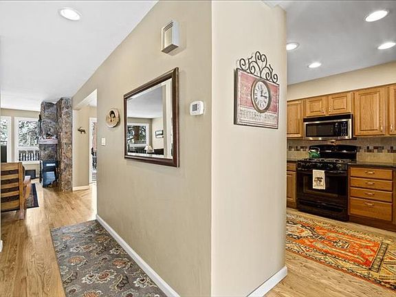 Tastefully Updated Townhome Style Condominium. Welcomed by a quaint flagstone patio, a perfect spot to enjoy the afternoon sun. As you enter the home you notice the glimmer of the newer wood floors, to your left a remodeled powder bath adjacent to the updated kitchen; nicely finished raised oak cabinetry are topped with a highly polished granite counter accented by a stylish tile backsplash and complimentary matching appliances. A good-sized dining room provides access to the second story private wrap around deck surrounded by towering pines and aspens. A wall of windows usher in plenty of natural light into the living room, a handsome floor to ceiling moss rock fireplace is great for warming the entire main level and creating a campfire glow throughout the room. Two master suites with remodeled baths and walk-in closets are located on the vaulted second floor. The walkout lower level with patio has the third bedroom and the fourth remodeled bath, the family room, laundry and mechanical. Please make sure to see the detached two car garage with additional storage, it is an end unit and is easily accessed from the circular paved community driveway. A true North Evergreen gem.