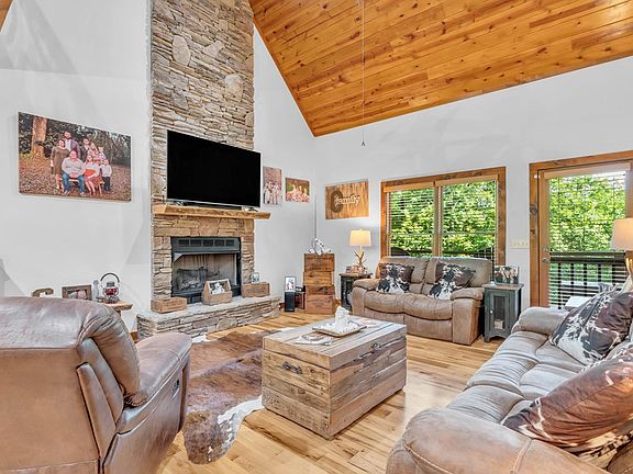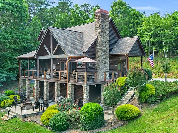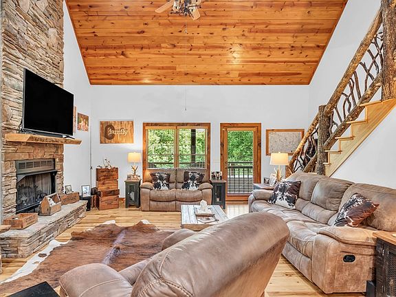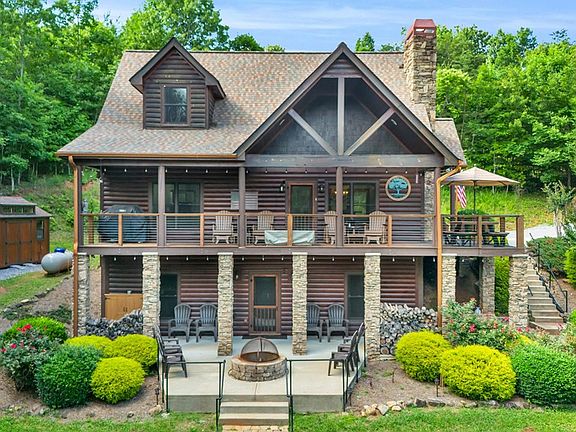 Offered fully furnished and attractively priced below its recent appraisal, this stunning cabin in Brown Haven Heights is set against a backdrop of seasonal mountain views and lush landscaping, offering the charm of mountain living with the comfort and flexibility of a thoughtfully designed home. Inside, cathedral ceilings and a floor-to-ceiling stacked stone fireplace create a warm welcome, while the open-concept layout flows effortlessly through the spacious living area, dining space, and kitchen—complete with stainless steel appliances and a unique hand-crafted stair railing for a personal touch. The main level features a large bedroom with tongue-and-groove ceilings, full bath, and laundry room. Upstairs, a loft opens to a private owner's suite with a walk-in closet, tiled shower, and jetted soaking tub. The terrace level offers even more room to unwind or host, with a second living area, game room, partial kitchenette, full bath, and oversized bedroom—ideal for guests or multi-generational living. Outside, a wraparound porch leads to a patio and fire pit area—especially loved for peaceful evenings under the stars. A detached workshop, tankless water heater, and paved access add to the ease of ownership. Whether you're seeking a full-time residence, mountain escape, or investment, this turnkey, fully furnished cabin is a perfect match—just minutes to Lake Chatuge, dining, shopping, and the best of Hiawassee.