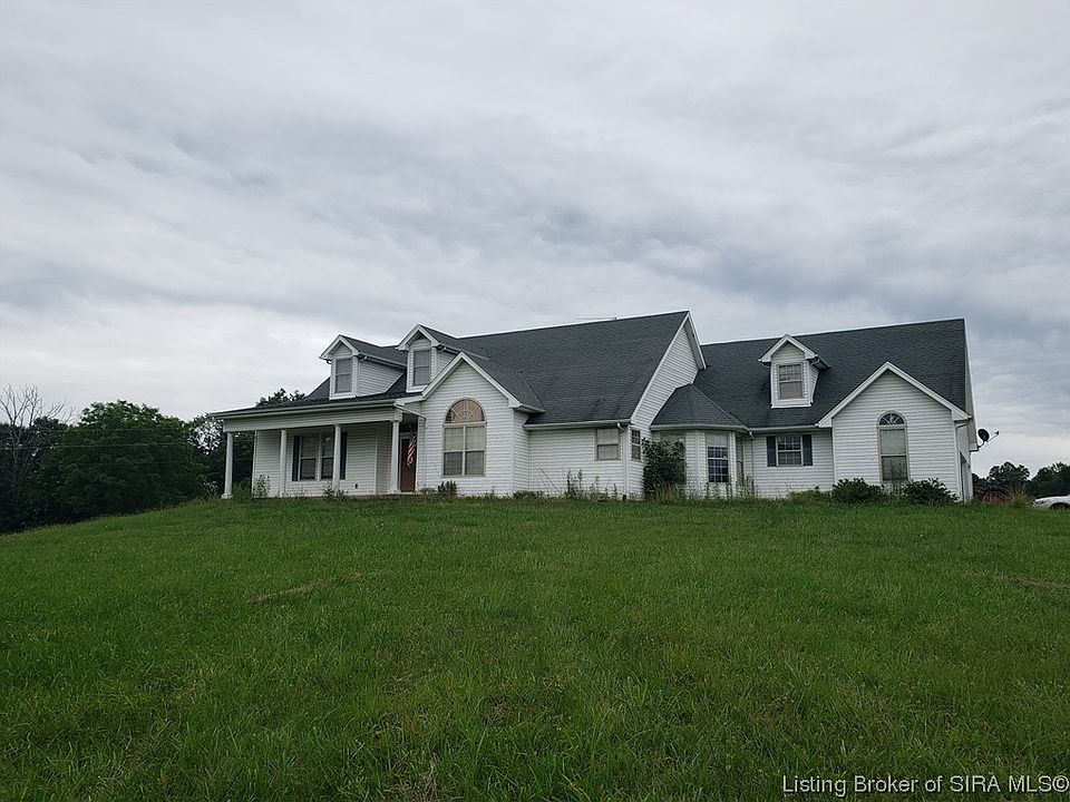 LOCATION, LOCATION, PEACE & SERENITY....you won't want to pass up on this custom-built 2800 sq ft, 5 BDR 2-1/2 bath home on a beautiful 14.55 acres! Master suite with double tray ceiling, master bath with separate vanities, his & her walk-in closets, large shower unit and jacuzzi tub. The great room and the formal dining room boasts cathedral ceilings and beautiful windows for lots of natural light. Large kitchen includes an abundance of cabinets and breakfast nook. Oversized 3 car attached garage with 2nd floor bonus room. Main level laundry includes lots of cabinetry and sink. All appliances stay including front load washer and dryer. Partial basement is unfinished with insulated walls. Then let's talk about the acreage that is mostly open, wooded border around the west and south sides that provides so much seclusion and allows you to enjoy the rolling country without road noise. The polebarn was used for horses in the past and includes a fenced pasture...so much more could be fenced for horses, cattle, goats....everything for small family farm use. This property is located 1 mile of Highway 160 with less than a 20 minutes commute to I-65 with easy access to Louisville or Indianapolis. Property selling as-is.