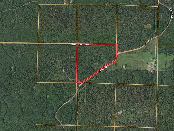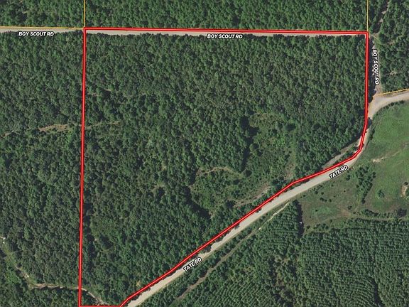 Midway along the south side road (Tate Road) is a driveway to enter the interior of the property. It is in good condition with a culvert and some recent gravel. The driveway leads through trees to an opening of roughly an acre. It would make a fine home site with enough room for outbuildings. It is far enough off the road and screened by trees to offer nice privacy from the road.