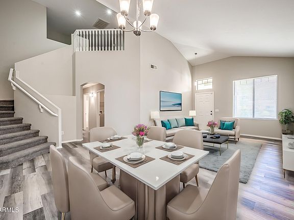 This spacious 5-bedroom plus den residence, featuring 3 full bathrooms, and vaulted ceilings is the definition of living comfortably! Enjoy the convenience of a bedroom and full bathroom located downstairs, ideal for guests or multi-generational living. This home has extra large rooms, a gigantic master suite, and an extended length garage. It's freshly upgraded with refinished cabinets in the kitchen and bathrooms, all new flooring including upgraded carpet padding, updated fixtures, new interior paint, one new a/c in 2023, and a fully landscaped backyard. It's situated on a quiet street with desirable N/S exposure, offering both comfort and tranquility. Turn key, move in ready!