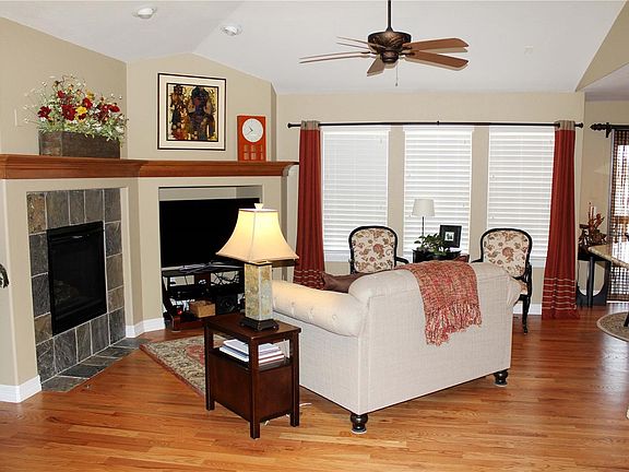 As soon as you see this gorgeous home with a wonderful location backing to open space with views of the park, you will want to make it yours. Come home to the beautiful hardwood floors that extend throughout the living room, dining room and kitchen and relax by the fireplace and entertainment area wired for surround sound. Enjoy cooking for your family and friends in the lovely kitchen with slab granite countertops, 42' cabinets with crown molding, a pantry and a breakfast nook. Use the 2nd bedroom with French doors as an office and work from home or escape to the master bedroom with quiet views, vaulted ceilings, a closet organizer and a master bath with a raised vanity and two sinks. Relax on the Trex deck and enjoy the fantastic views of the open space and Red-tailed Hawk Park. There is plenty of storage space with built-in storage shelves in the garage and walkout basement too.