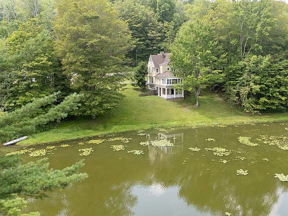 Historic "Honeymoon Cottage" in Rexmere Park, Stamford NY "Queen of the Catskills". Built in 1898 as part of the Rexmere Hotel complex this charming lakefront cottage welcomed newlyweds during Stamford's resort era. Now a private home the "Cottage" has been updated and modernized for today's living. A light filled sunroom overlooks Churchill Lake with distant views of Mount Utsayantha. A living room, dining room kitchen and full bath make up the main level retaining original fireplaces hardwood floors and chestnut woodwork. Upstairs are three bedrooms and a full bath. A third floor offers two more rooms. The basement level opens directly on to a covered patio and has two additional rooms as well as space for the houses systems. In addition to the house a two-bay garage with workshop, office and bathroom were most recently used by a custom home builder. This building has been used for commercial purposes and has direct access to NYS 23 an important east west throughfare.