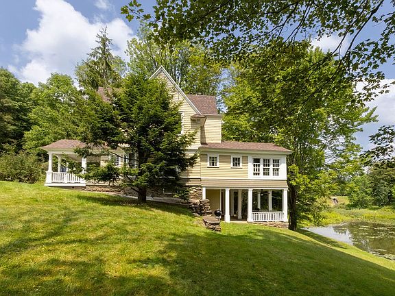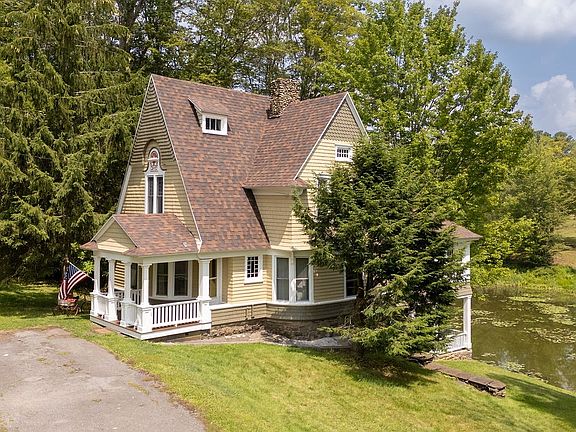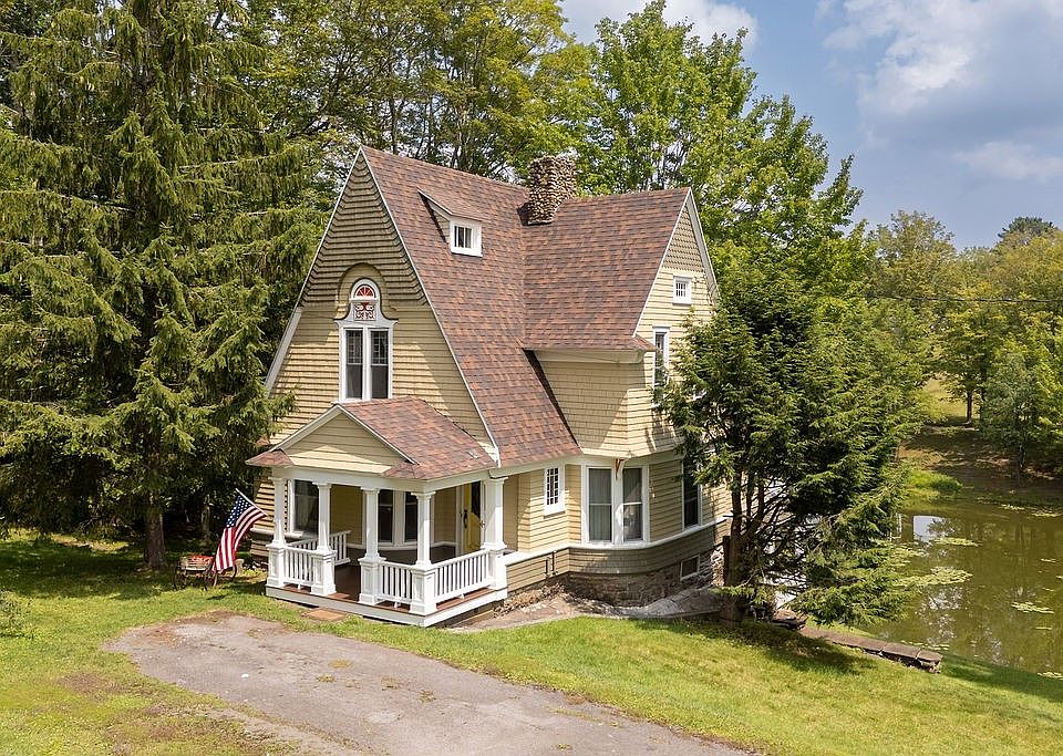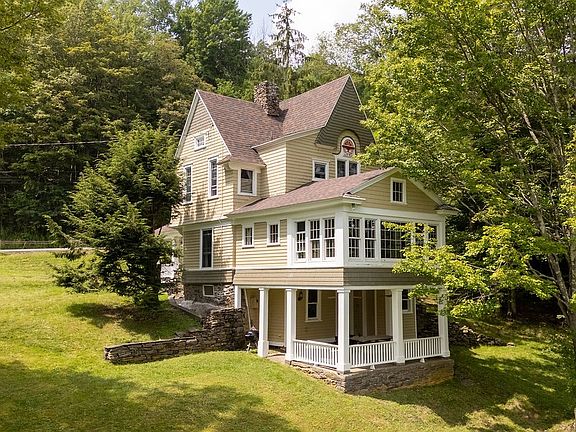 Historic "Honeymoon Cottage" in Rexmere Park, Stamford NY "Queen of the Catskills". Built in 1898 as part of the Rexmere Hotel complex this charming lakefront cottage welcomed newlyweds during Stamford's resort era. Now a private home the "Cottage" has been updated and modernized for today's living. A light filled sunroom overlooks Churchill Lake with distance views of Mount Utsayantha. A living room, dining room kitchen and full bath make up the main level retaining original fireplaces hardwood floors and chestnut woodwork. Upstairs are three bedrooms and a full bath. A third floor offers two more rooms. The basement level opens directly on to a covered patio and has two additional rooms as well as space for the houses systems. In addition to the house a two-bay garage with workshop, office and bathroom were most recently used by a custom home builder. This building has been used for commercial purposes and has direct access to NYS 23 an important east west throughfare.