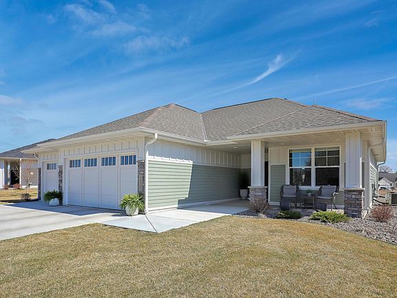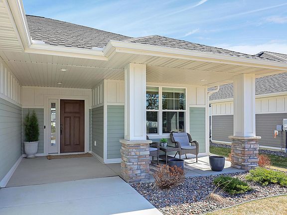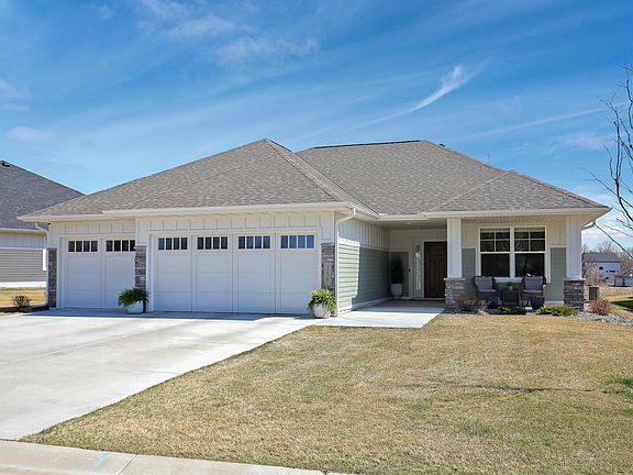 Welcome to this three bed, two bath beautifully custom-built home situated on a premium lot with serene pond views. Thoughtfully designed with comfort, this property offers exceptional features throughout, including 3-car finished, insulated and heated garage, sunroom filled with natural lighting, built-in sound system (interior + patio) and video surveillance (front & back). As well as large center island with cabinets on both sides, premium high trim, 9-10 ft ceilings throughout the house, kitchen with 42" upper soft-close cabinets and kitchen aid appliances. Details of the home were carefully picked with built-in custom bookshelves in the living room and a custom master closet. The house also includes wide 36" interior doors, tile flooring in bathrooms and mudroom, tile shower and bathtub, high-performance dual washer and dryer included, gas fireplace, and concrete driveway. This home combines luxury, function, and style- perfect for those seeking quality craftsmanship and peaceful views. Build by Benzinger Homes.