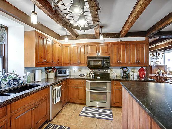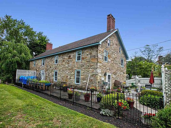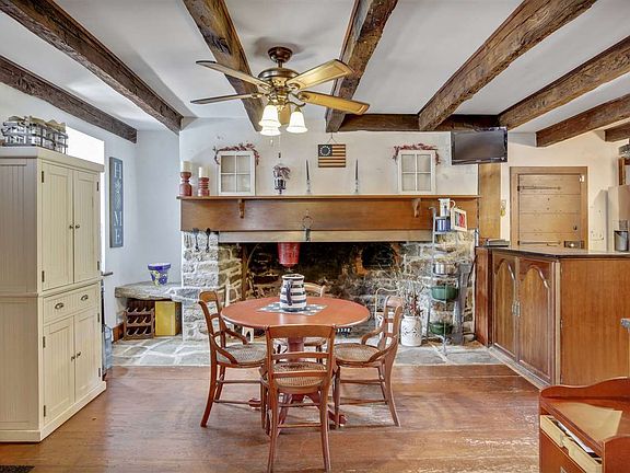 Charming historic carriage style home hits the market meeting the world's demands for outdoor space and privacy. Its pleasing stone faced facade with a backdrop of over 3 acres of picturesque landscape and pond is a certain peaceful image to capture. Walk in from your home grown garden, patio/barbeque area to a hearty country style kitchen with an impressive fireplace and dining space along with ambitious floor to ceiling sized cupboard doors made spacious enough to even catch Martha Stewart's attention. Stretching your thoughts become enjoyable when standing in between gorgeous wide plank floors and natural real wood beams that brand its pleasant ceilings throughout. Warmth and character fills each of the three floors granting generous living space to accommodate any living requirements including up to 5 bedrooms or more. Main bedroom quarters offer a grand ensuite with an updated bath. There's more, working from home just got easier when you move into your home office with built in bookcases while still keeping an eye out on your routine. Sold "as is" this lovely home's location makes it ideal for schools, commuting by train or bus, parks, shopping, and nearby dining. 2 out buildings/barns equipped with electricity can be utilized to any desired capacity including recreation, garage, and/or workshop activities. There's more to see and love in person, so break away for a breath of fresh air and book your safe and easy showing today!