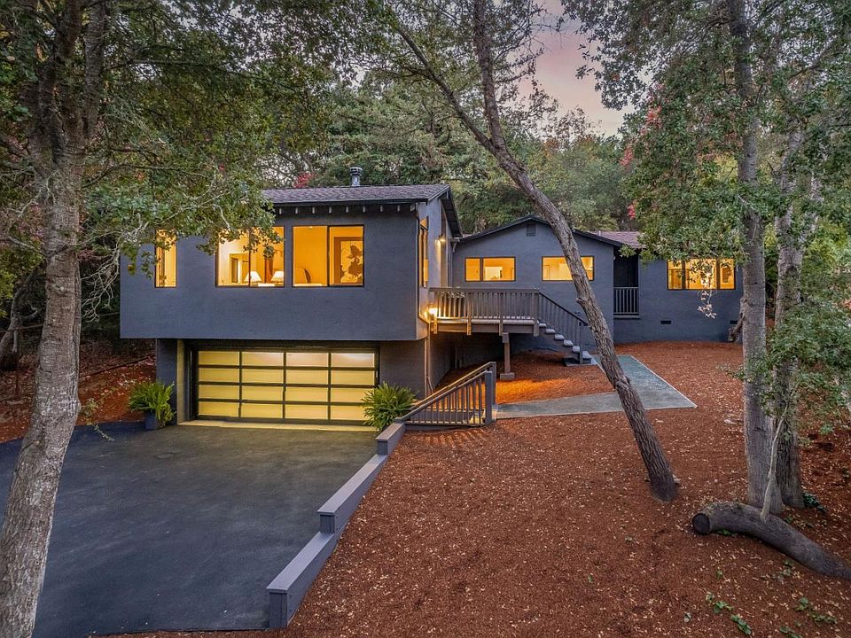 Freshly updated, this home harmonizes with the natural beauty of this Corte Madera neighborhood. Capitalizing on the captivating vistas and terraced rear gardens, the home has been thoughtfully expanded with an opportunity to accommodate an Accessory Dwelling Unit or an optimal work-from-home office, if desired. Freshly painted inside and out, and with newly refinished hardwood floors, the home is ready to move in and enjoy today, while also offering the prospect of further customization. The generously proportioned front room, complete with a dining area, fireplace, wet bar, and full bath, provides versatility in use, preceding the eat-in kitchen and spacious great-room with second fireplace and access to the rear yard. A separate wing comprises three bedrooms and two additional bathrooms, including the primary suite. Enhancing the allure is an expansive garage easily accommodating four cars in tandem or offering potential space for a range of alternative purposes. Merely a few blocks away is Roberts Market and the esteemed Corte Madera School (serving grades 4-8), in addition to an extensive network of hiking and biking trails renowned throughout Portola Valley.