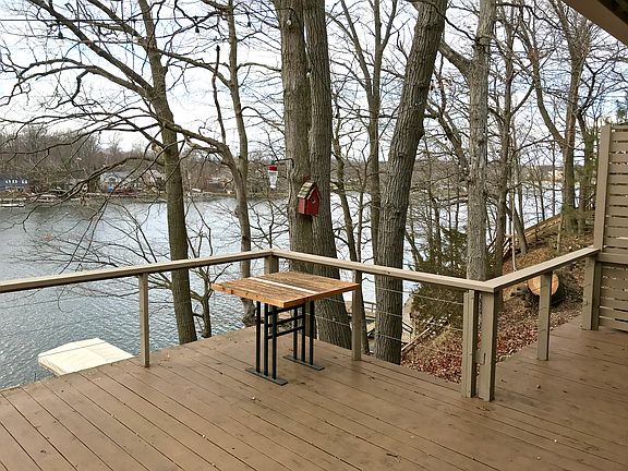 Property Overview - Extraordinary water frontage - Low idle, deep waterfront with approximately 140' of shoreline is the perfect setting for this contemporary, open-concept ranch. Nestled among the trees, you'll enjoy beautiful views year-round - soaring ceilings, multiple fireplaces, an abundance of windows & natural light, stainless kitchen w/breakfast bar, en suite master w/tiled shower, fabulous walk-out lower level, & many indoor/outdoor entertaining spaces - all designed to connect you with the water & its surroundings. Lush landscaping, low-maintenance, steel sea wall, 28' straight dock with 4' deck, 20' straight dock with 10' sun deck, two new electric covered boat lifts, one 4,500lb lift and one 6500lb cradle lift and so much more! Live like you're on vacation and enjoy the amazing view throughout the year! (The boats do not come with the property)