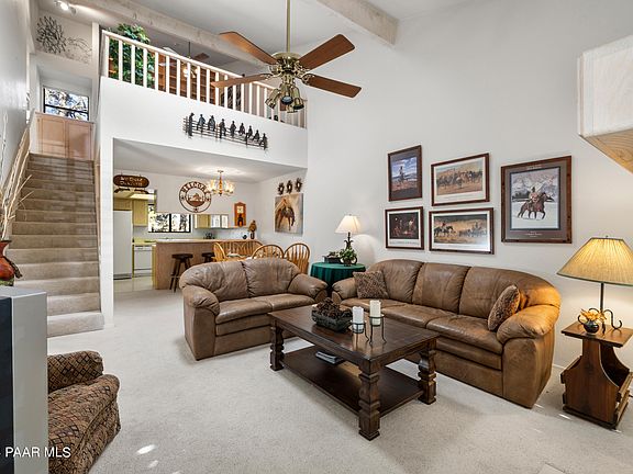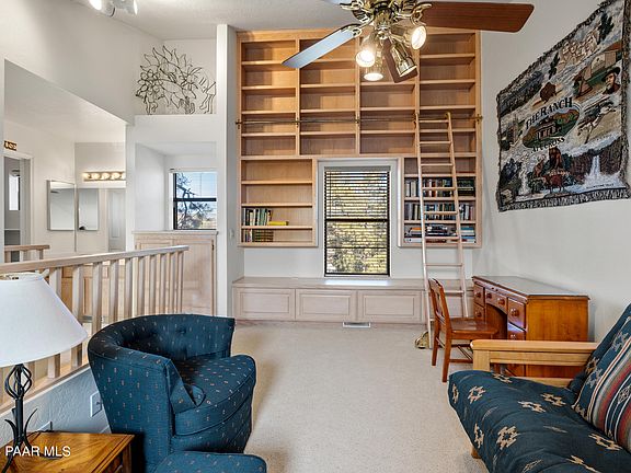 Easy lock-and-leave end unit condo in the tall pines close to historic downtown Prescott's shops, restaurants and events, National Forest trails, Dignity Health, Yavapai College, and public and charter schools. Perfect for full-time living or a part-time escape from the Valley heat. This quiet little community of Pine Creek Estates has a pool and community building for meeting the neighbors (no rentals allowed). Main level features a great room with vaulted ceiling, fireplace, open concept kitchen and dining, primary suite with a slider to the front deck and walk-in closet, a laundry center with stackable unit, and back door leading to a private deck looking out at trees and blue skies. Upstairs has a loft (potential bedroom) featuring a fantastic ceiling-to-floor built-in library with