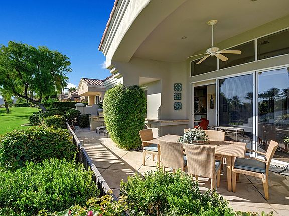Available only May 2025 - October 2025 at $3,750 per month plus utilities. Leased for 2026 season. Landlord's Golf cart & membership available for Tenant use with membership approval with 3 month minimum rental. One of a kind Mesquite 5 floor plan beautifully updated in Palm Desert! At approximately 2,706 square feet with 3 bedrooms and 3.5 baths this home includes a rare sitting room and office off of the primary bedroom. Spectacular views of the mountains and 1st hole of The Grove course will wow you! Updated kitchen includes new appliances including a Subzero refrigerator, Quartz countertops, freshly refaced white cabinets with new hardware, tile backsplash and wine refrigerator. Primary bedroom includes a custom sitting room and office that overlooks a serene garden complete with spa and waterfall. Primary bathroom is stunning and completely remodeled with white herringbone tile flooring, brand new soaking tub, walk-in shower with Quartz walls, Quartz counter tops, newly refaced cabinets, new hardware and designer lighting. This home also includes a large electric solar system in place, new 50 gallon water heater, newer A/C units, sound system throughout the home, new glass windows in the bedrooms and living area, newly painted cabinets and Quartz counters in the guest bathrooms and so much more. Available only May 2025 - October 2025 at $3,750 per month plus utilities. Leased for 2026 season. Landlord's Golf cart & membership available for Tenant use with membership approval with 3 month minimum rental. Tenant pays gas and electric (has solar for electricity). Tenant to pay one time exit cleaning fee. Landlord pays HOA dues includes cable/internet. Contact agent about pets. Security deposit subject to change.