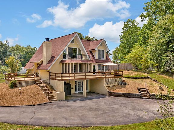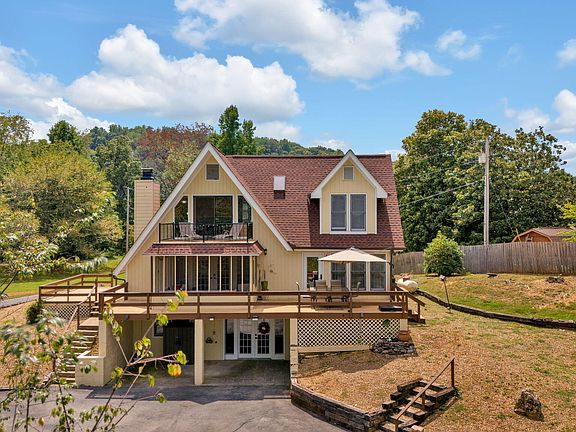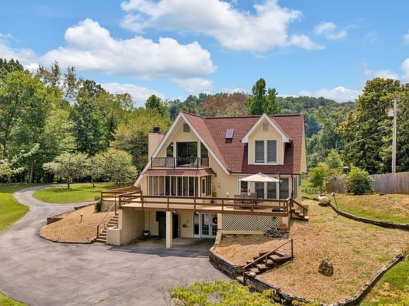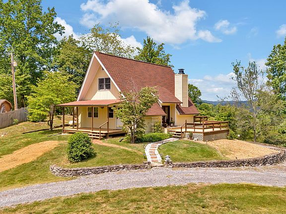 Are you looking for a unique and updated home? This modern gem might be exactly what you need! Located in Blountville, TN, this charming A-frame home features 4 bedrooms and 3 full baths, with the potential for a 5th room in the fully finished basement. As you drive up the long driveway onto over 2 acres of serene, open country land, this home welcomes you with its quaint yet contemporary design. The large living room on your right offers a wood burning fireplace and access to a screened-in porch that overlooks nothing but peaceful trees and wildlife. Back inside, you'll find a convenient laundry room with a sink, ample storage, and counter space. The main level also hosts the first bedroom and a full bathroom. Head towards the spacious kitchen, which boasts plenty of cabinets, a newer refrigerator and dishwasher, and new granite countertops on the island. Step out onto the uncovered porch to enjoy your morning coffee in peace and quiet. Upstairs, you'll find two more bedrooms. One is oversized with tall custom ceilings, and the second bedroom offers a sliding glass door onto a deck with a gorgeous Mountain View, upstairs also offers a large walk-in closet, and a full bathroom. Heading down two to the basement, you'll discover the 4th bedroom and a possible 5th bedroom, which could serve as an office, playroom, or anything else you envision. The recently finished basement includes a 3rd full bathroom with a walk-in tiled shower, double vanity and a walk-out entrance to the bottom of the driveway, making it perfect for an in-law suite or even a rental opportunity. This room is fully ready to add a wet bar/ kitchen. This home has lots of updates but not limited to : tankless hot water heater (gas), water filter, Finished basement (Workout room) 2024, 2020: roof, some new exterior doors, Heat pump, exterior paint and More! Please ask for a full list of improvements. Buyer and Buyers agent to verify all.All info taken from seller/crs info