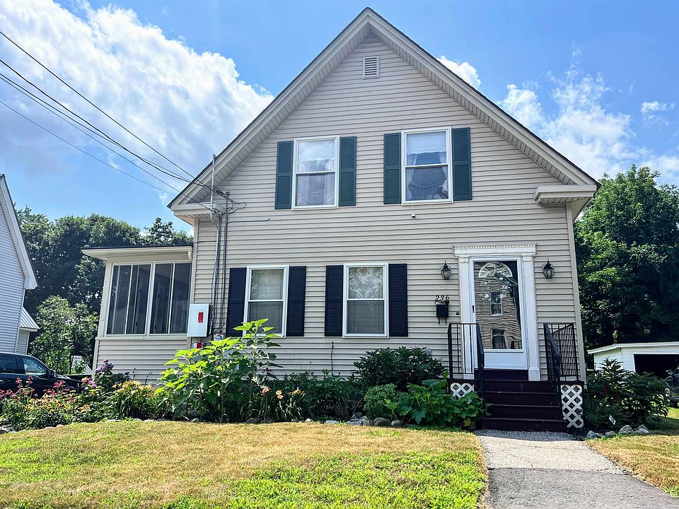 Welcome to this charming 4-bedroom, 2-bathroom New Englander-style home, nestled in the heart of Laconia, NH, in the sought-after Lakes Region. This beautifully remodeled home offers 2,100 square feet of living space, perfect for the growing family. The modern kitchen is a highlight, featuring granite countertops, oak cabinets, a stylish tiled backsplash, and newer stainless steel appliances, making for delightful space to prepare for simple meals or large family events. The main floor also includes a spacious living dining and family rooms, which makes for a great layout for everyone to have their own space when need. Additionally, there is a convenient first-floor bedroom, a full bath, and laundry facilities. The second floor features three large bedrooms, including a primary bedroom with vaulted ceilings, providing a luxurious retreat. The home is equipped with energy-efficient appliances and windows, with recently installed solar panels enhancing the homes appeal. Furthermore, the home boasts a cozy sunroom and a large deck overlooking a flat, level lot, perfect for a vibrant garden or fun activities with the family or your beloved pets. Convenience is assured with a single-car garage and a double-wide driveway. Ideally located, this property is within walking distance to Bond Beach, Leavitt Park, Lakeport and local schools, and just short drive to sought after destinations for both food and entertainment. It's a perfect blend of both modern and old New England charm.