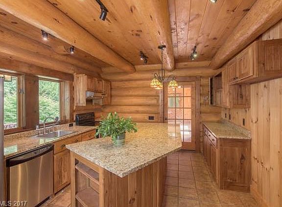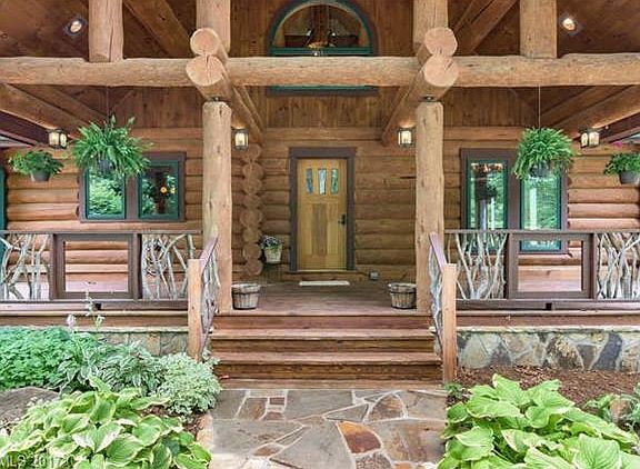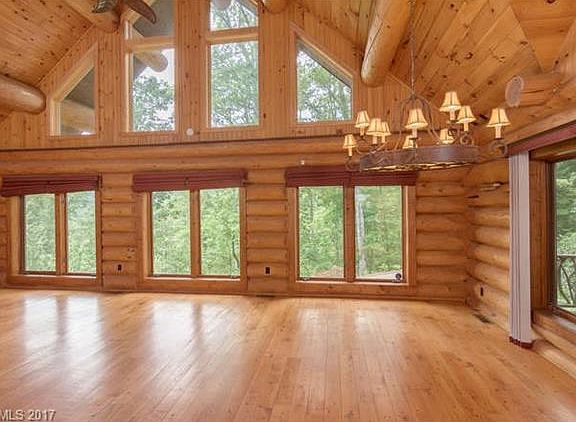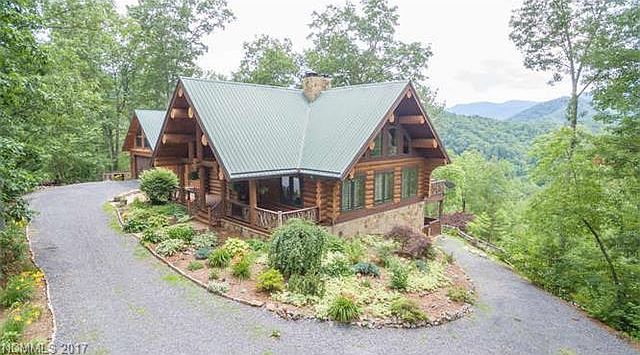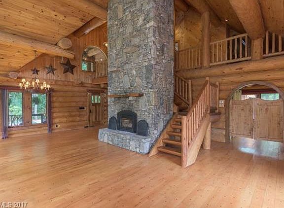 Full log Swedish Cope piece of art w/soaring ceilings, dry stack FP, carved mantle, maple floors. Private estate, 4.87acr ridge-top. Stunning view, stone patio,fire-pit, hot tub - luxury living. Prepper/sustainable minded will enjoy edible landscape, chicken house, redundant systems, generator-ready, trap door-safe rm,steel bunker. Kitch: granite,stainless,tile flr. Lrg garage w/walk-up storage. Incl addt'l 0.75acr site w/septic, shared well. Adjn 0.59acr avlbl, not incl.Close to Waynesville.