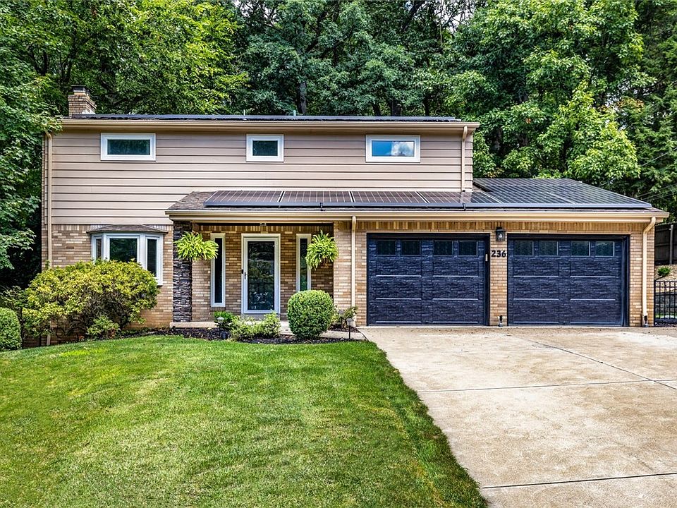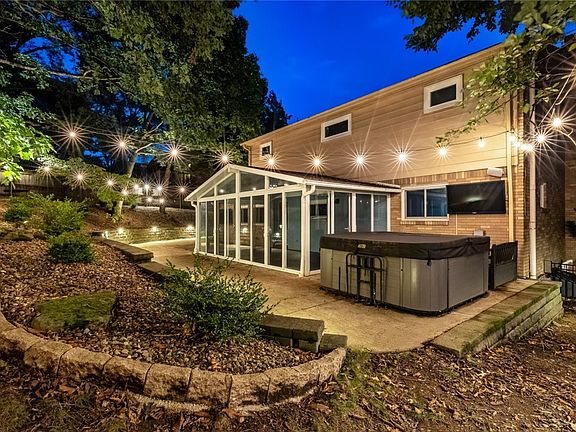 An abundance of updates and upgrades! Exceptional location! Picturesque lot backs to woods. Walking trail to Middle, Intermediate and Elem schools. Updates inlcude: kitchen w quartz countertop, backsplash,pull-out shelves, coffee bar, newer stainless appliances including gas stove, opened wall for breakfast bar, LVP in Fam Rm, epoxy flake floor and new sliders in sunroom, Extended patio/hot tub/2 ext. TV's, Used to be a 5 BR home, converted 1 BR to create Master Suite with large walk thru closet, vanity area, Master Bath w steam shower, custom tile & 2nd fl laundry, Updated secondary full bath w tile, Finished basement w custom bar, dishwasher, surround sound, 1/2 BA, addtnl. room/den, storage rooms, New garage doors, lighting inside and out, windows, Tankless H2O tank, Solar panels w Tesla backup battery, New concrete drive. Epoxy floor in grg w hanging storage racks. Shed, bball hoop, playset convey. Also features HW in LR/DR, Br's.