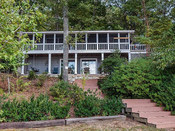Completely furnished & move in ready, this charming lakefront home offers over 100' of water frontage w/ open water views & stunning sunsets. The kitchen opens to family room w/ stone fireplace & large flat screen TV (included) open to comfortable screen porch. 2 BRs, 2 Baths complete the main. Downstairs is large bunk room sleeps 6, sitting area & full bath leading out to covered terrace. Exterior: Double boat house (2011), Decks w/ built in seating, fenced yard, & lush landscaping,