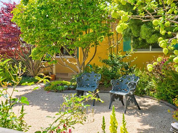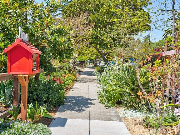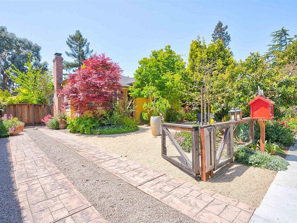 Don't miss this storybook retreat in Mount Carmel! Stunning professionally-designed gardens provide multiple outdoor vignettes and seating areas. Built-in BBQ, fire pit, raised vegetable beds, fountain, even an outdoor shower! Classic design includes natural oak hardwood floors, white trim, crown molding & recessed lighting throughout. Open-concept living room/dining/kitchen ideal for entertaining. Breakfast bar leads into the kitchen with vibrant solid cherry wood cabinets, gas stove, stainless steel appliances, a large pantry & low-maintenance countertops. Remodeled bathroom with floor-to-ceiling tiles. Built-in, custom office cabinetry with 2 desks and Murphy bed. Detached 2-car garage finished & transformed into a flexible-use room brightened by skylights and French doors, a vaulted ceiling with beams and a whimsical chandelier, & a practical half bath. EV charging station. Air conditioning. Easy access to 101 & high-tech campuses. Walk to parks and vibrant downtown Redwood City!