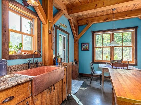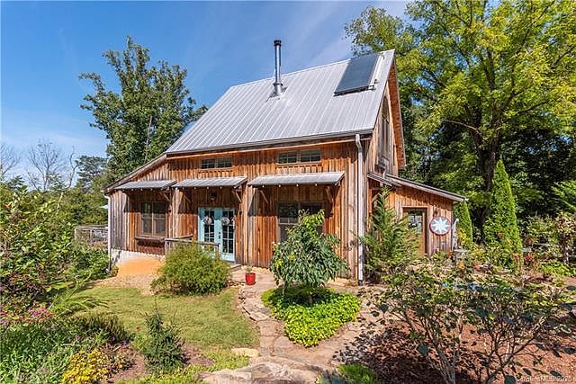 UNIQUE... overused word. Not this time. This amazing small farm is 15 minutes from Asheville and 5 minutes from the quaint town of Weaverville. Timber frame house has vaulted ceiling great room; and kitchen with Amish built wood stove used for cooking and heating; walk in pantry. Solar water heater. Upper level has bedroom, bath and sitting room/office. Screened porch perfect for entertaining; large deck; mud room AND newly built timber frame studio perfectly located from main house has loft and screened porch. 1,000 sq. ft open barn with loft, wood shutters and electricity, What a possibility for a second housing! Located for possible solar. The "chicken chapel" has shake roof; 2 goat houses and sheep house. 16 different types of fruits; perennial plants, herbs; beautiful stone work abounds. Bonus - outdoor kitchen, outdoor shower. Yes, UNIQUE is a true description. Treat yourself to a break from quarantine with a tour. Amish cook stove remains.