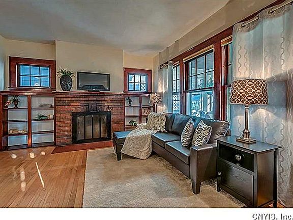 Here is a wonderful American Style Bungalow home with lots of natural woodwork. Enter the home through the enclosed front porch we you will enjoy sitting and relaxing. From here you will enter a foyer with a front closet and a bannistered stair case. Walk through the French door to a large formal living room featuring a brick faced fireplace adorned by curio shelves on each side. You will enjoy formal dining in the dining room or a more casual meal in the large updated kitchen featuring cherry cabinetry and lots of cabinets and counter. Also first floor laundry right off the kitchen.