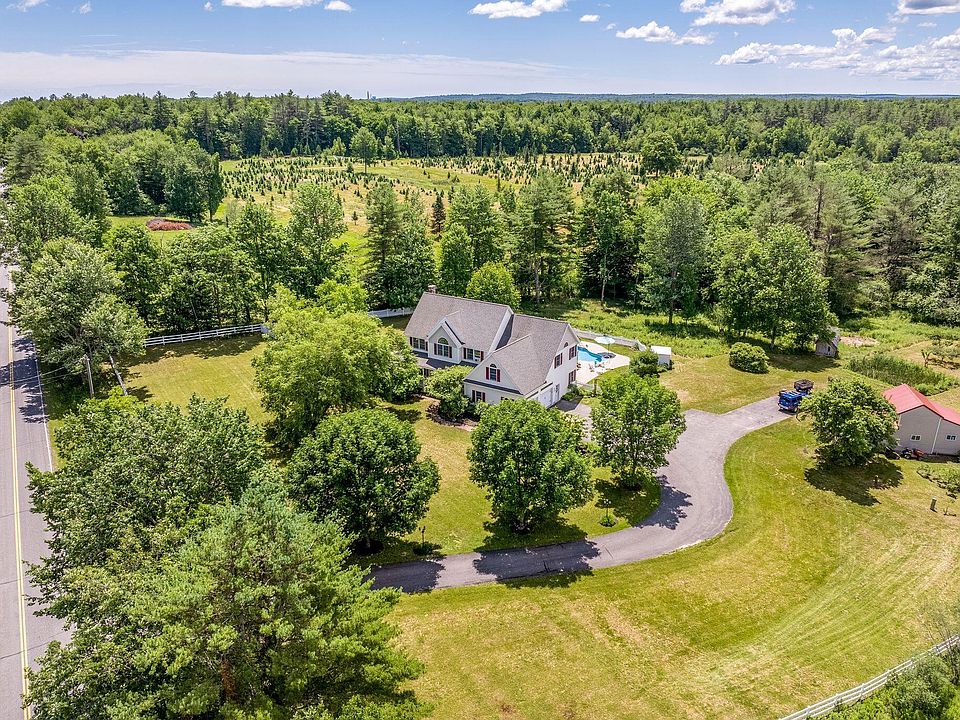 Contemporary farmhouse on 4.86 acres in North Yarmouth. Close to Yarmouth Village, Cumberland Center and North Yarmouth Center. This property would make a wonderful working or hobby farm. The current owners added an extensive chicken house and run, vegetable gardens, fenced in dog area, catio, and separate fenced area for additional outdoor space. They also added solar panels and a fast charger for EVs. There is an orchard with apple, plum and peach trees, maple trees for sugaring, blueberries bushes, a pond with natural waterfall, and trails with 2 bridges crossing the brook. You may choose to relax by your in-ground pool and gazebo, tend the many flower gardens, sip your beverage of choice on the wrap-around porch while watching views of sunsets and wildlife. The outbuildings also offer plenty of additional space for gardening, private home office or workshop, and storage for your tools, yard equipment, and bicycles, The inside of this 4 bedroom, 2.5 bath home has also been updated with an additional family room on the third floor. This space would make great guest quarters, playroom or media room. It has a heat pump to keep everyone comfortable. The primary suite has been updated with stunning mahogany bookcases, a rolling ladder, and a cozy window seat. There is a sweet room off of the primary suite that would make a lovely dressing room, another home office, or nursery. Ample walk-in closets and an en-suite bath with tub and separate shower, as well as a water closet, round out this luxurious space. There's also a Security System and whole house generator. If that is not enough, the entire first floor is radiant heat. To have a heated garage in Maine is an extraordinary benefit! If you are looking for space both inside and out in a lovely rural setting, yet close to everything, this home is for you!