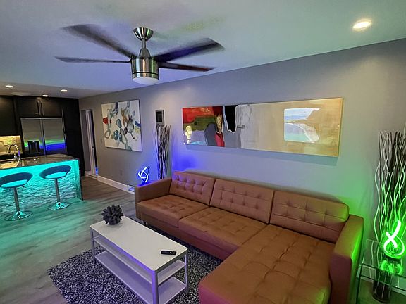 Modern one bedroom apartment, with high end finishes everywhere. This standalone apartment has a gourmet kitchen with granite countertops, stainless steel appliances, large island with eat at bar area, pantry cabinet, pull out trash and recycling, and recessed lighting. Large bathroom with walk in shower featuring floor to ceiling tile, rain shower head with body spray, tongue and grove wood ceiling, and recessed lights. Bedroom features large walk in closet with front load washer and dryer. Queen pillow top mattress, computer desk with office chair and high speed Wi-Fi with dedicated router. Hardwired ethernet connections in the kitchen and bedroom desk area for those looking to work from home. Ceiling fans in the living room and bedroom, recessed lights throughout the apartment, all on dimmers for setting the perfect mood. The apartment is fully furnished and decorated with modern stylish art. No expense was spared in crafting the perfect ambiance. RGB LED mood lighting in various locations. 65" Roku Smart TVs in the bedroom and living room. The apartment has a dedicated parking spot with a 20amp 120volt outlet for charging EVs. All utilities included in the monthly rent. Centrally located in Daytona Beach only a few miles from local colleges, ERAU, DSC, BCU, Daytona Beach airport, Flight Schools, Halifax Hospital and a quick 10 minute drive to the beach. No Pets, No Smoking, No Drugs, No Excessive Drinking, No Slobs and No Party People. Flexible rental terms 1 year lease, or month by month, move out anytime with 30 days notice. Deposit plus first month's rent moves you in.