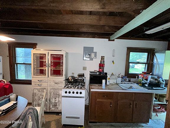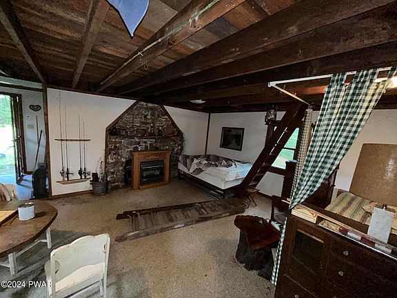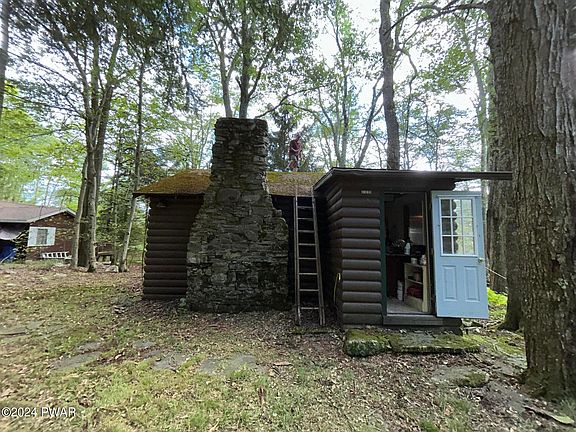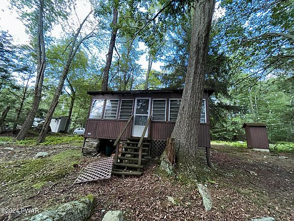 Rustic Promised Land Technical Lakefront Log Style home with Stone Fire Place. Walk Across Street to Lake. Seasonal Lake View (You'll see a little in the summer) This is a rustic cabin in the woods with the advantage of $200 a year lease and under $900 a year Taxes. Recreate in Nature with access to the LARGE Promised Land Lake. Go to the beach, Walk in the woods or use as a hunting / fishing cabin. The Stone fireplace is Classic, as is the heated outhouse. Newer roof protects you from the elements.