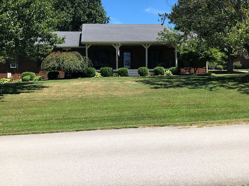 This sprawling well maintained brick ranch home is located on a large beautifully landscaped .73 acre lot in one of Trimble Counties nicest subdivisions. This home boasts nearly 3000 sqft including the converted garage space currently used as a 5th Bedroom. There are 4 additional bedrooms including a spectacular master suite, 2.5 baths, a spacious living room, a large nicely appointed eat in kitchen and a bonus room with many possible uses. The outdoor spaces are wonderful for family and friends gatherings featuring a lovely front porch, a massive 26 X 35 patio area and covered rear porch both with access from the kitchen. There is a nice workshop with garage storage space for yard equipment and a 12X36 residential utility building finished inside and has its own electric meter and A/C.