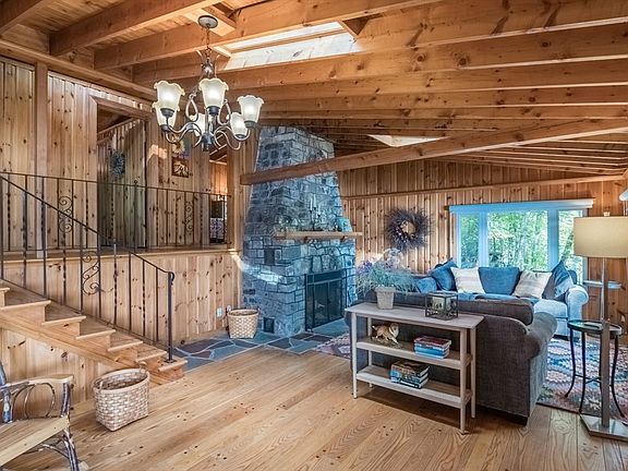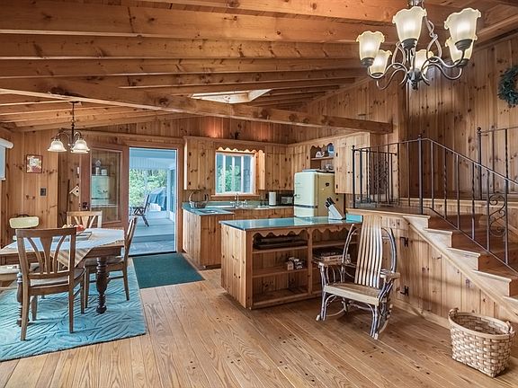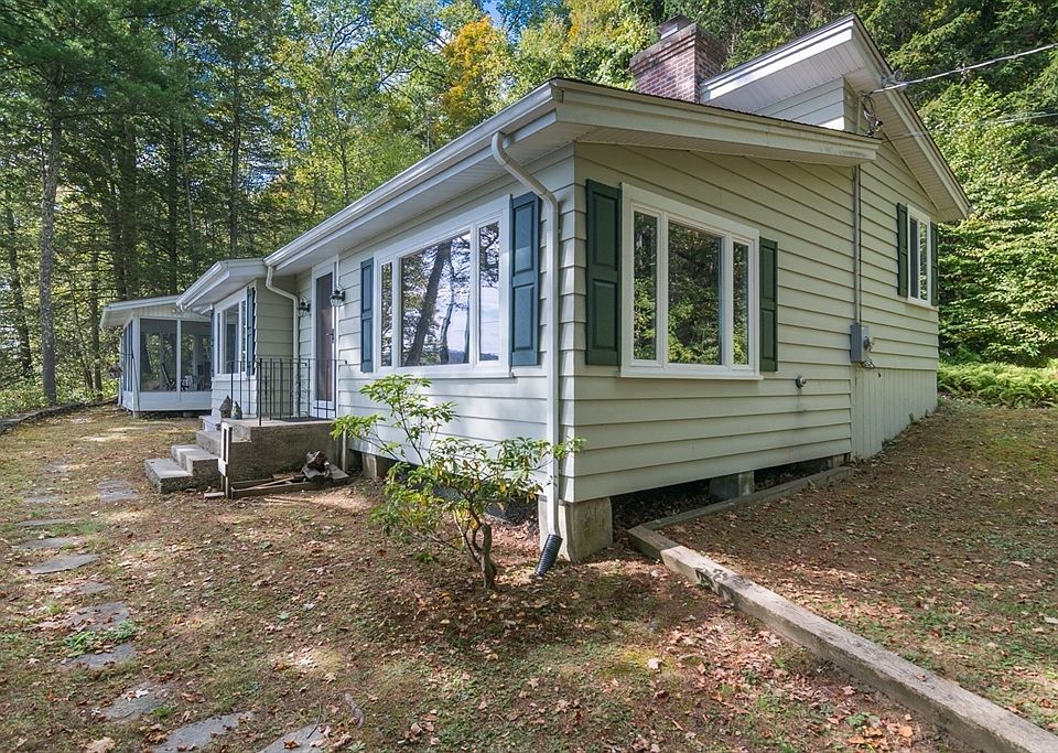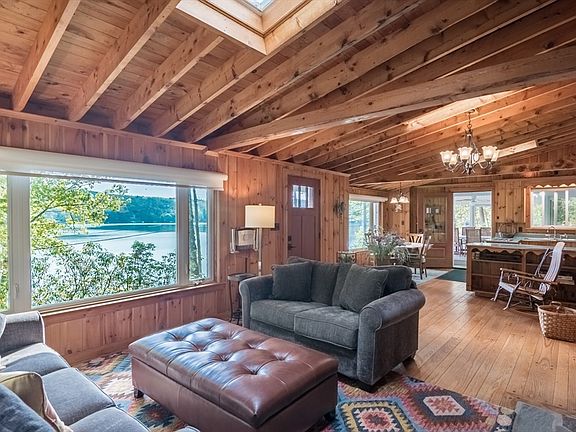 Welcome to your dream lake house! Charming seasonal cottage w/knotty pine walls + lofted ceilings, recently added skylights + all new Pella windows + doors, creating a light-filled living space w/epic views. Main room includes nostalgic original kitchen w/formica counters, built-in stovetop, + new retro refrigerator. Dining area + living room include large original stone fireplace - a beautiful centerpiece for the room. Rinnai propane heater provides back up heat for chilly nights. Split level second floor includes three spacious bedrooms + 1 full bath. Off kitchen is large screen porch w/both trex + stone floors. Each room in house is oriented towards the beautiful, 122 acre Norwich Lake - with pristine waters for FISHING, boating and swimming!! House includes 100 FT OF LAKE FRONTAGE providing ample opportunity to build a private deck at the shoreline. Home conveys with 2 private docks. First lakefront home for sale @ Norwich Lake since 2024. 30 mins to Berkshires or Northampton
