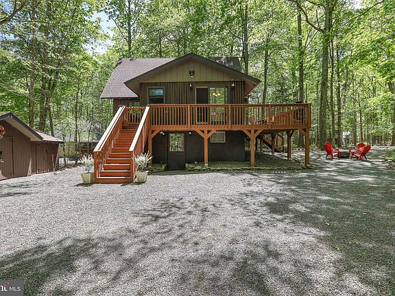 This place is a total vibe! Tucked away on a private corner lot in amenity-rich Locust Lake Village, this fully furnished A-frame chalet is the perfect mix of vintage charm and modern updates. From the moment you step onto the wraparound deck and through the front door, you're transported into a wall-to-wall cedar time capsule—soaring vaulted ceilings, exposed beams, and a stunning stone wood-burning fireplace set the mood. 236 Ridge Rd has been lovingly curated and cared for and it shows. The open-concept main level glows with natural light from narrow skylights, blending nostalgic style with functional updates. The kitchen features new stainless steel appliances, while two bedrooms and a full bath with original green tile add to the home's throwback appeal. Upstairs, the lofted primary bedroom offers a vaulted ceiling, its own skylight, and peaceful treehouse vibes. Downstairs, the finished walk-out basement has a new drop ceiling, great light and airflow, a half bath, and a brand-new washer and dryer in the mudroom. Two large outdoor sheds provide extra storage, and the new hot water heater adds peace of mind. Outside, enjoy the wooded serenity of a wraparound driveway with dual road access, and a large deck perfect for lounging or entertaining under the trees. Nearly everything you see comes with the home—furnishings, vintage décor, housewares, and art—each piece thoughtfully chosen by generations of owners who treated this home as more than just a weekend retreat. As part of LLV, you'll have access to three stocked lakes, sandy beaches, a ski hill, playgrounds, hiking trails, tennis courts, and community events. You're also just minutes from local favorites like Jack Frost, Moyer's Country Kitchen, Jubilee, and Wawa. Whether you're searching for a peaceful escape or a profitable investment, 236 Ridge Rd delivers. Smaller homes in the area have generated up to $3,000/month in short term rental income. They don't make them like this anymore!