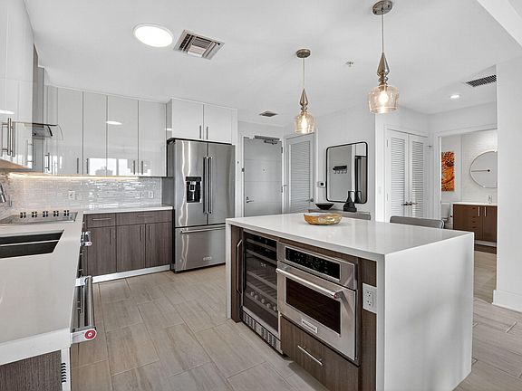 Live the downtown Delray lifestyle in this penthouse-level 1-bedroom condo at 236 Fifth, one of the area's most sought-after newer buildings. Enjoy ocean glimpses from your oversized private balcony and designer finishes throughout. The open-concept kitchen features a quartz waterfall island, two-tone cabinetry, mosaic backsplash, KitchenAid appliances, and a wine fridge. You'll have access to the Aloft hotel amenities including the resort-style pool, fitness center, restaurant, and bar, along with a private residents-only club room with wine lockers. Covered garage parking and private storage locker are included. With smart-key building access, concierge, and a prime location just two blocks from Atlantic Avenue and 1.1 miles from the beach, this is luxury living at its best.