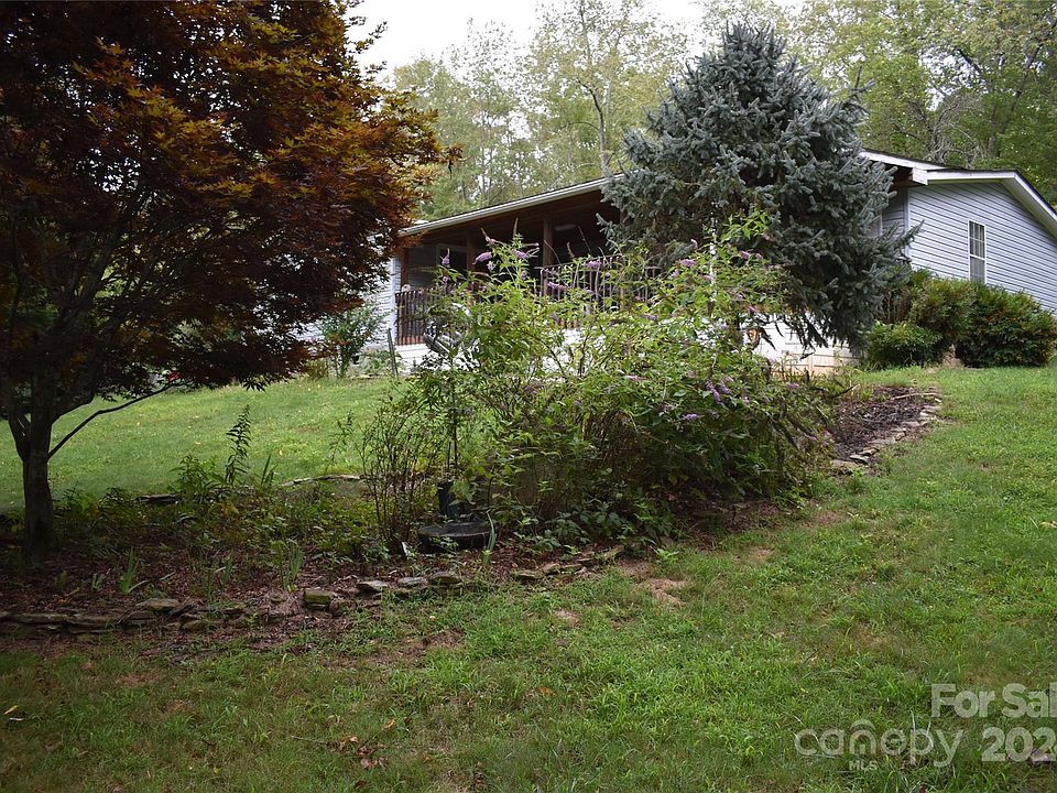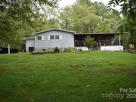 Immaculate Triple wide manufactured home on 1.37 acres, very private lot with lots of trees, plants, apple tree, private patio and gazebo with a koi pond. Property is an estate and the landscaping needs some TLC, but the bones are there. Home has 3 brs and 2 baths updated and spacious. Living room has gas logs, wainscotting and sloped ceiling. Kitchen is spacious with a breakfast area with atrium doors extending to a private 13x30 covered porch. Walk-in closets, jetted tub, walk-in showers, split bedroom design, mudroom with cabinets and counter. New carpet in bedrooms. Propane tank in ground owned. The attached double carport and large level concrete driveway lead to the covered ramp side entrance. Home has a newer heat pump and is move in ready. 3 Outbuildings, washer, dryer and ref all included. Home is off 110 and only minutes from Asheville, Waynesville and the Blue Ridge Parkway. This is an estate and selling as-is.